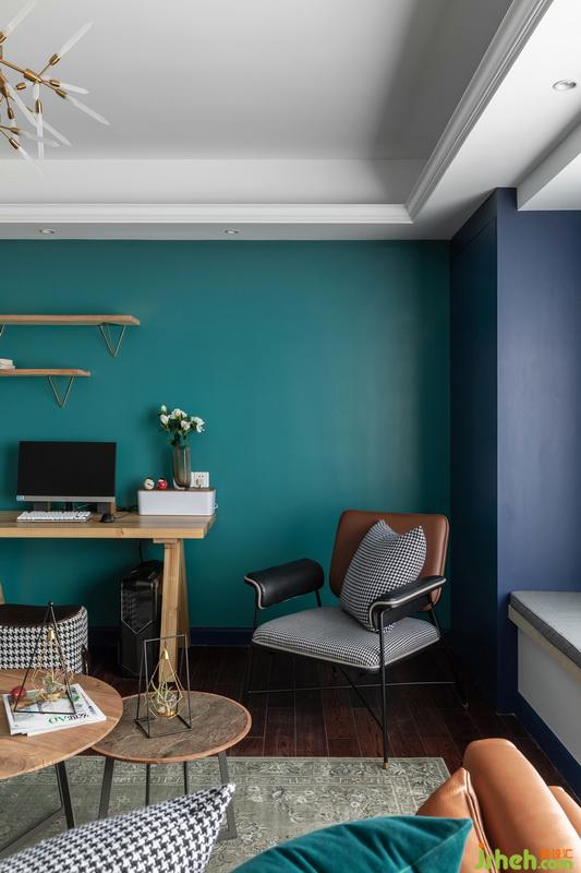客厅飘窗保留了下来,根据现场情况在前后两处制作宽为96公分,深度67公分的柜子。将客厅一角安置电脑桌,上方两个置物架,个性又实用。