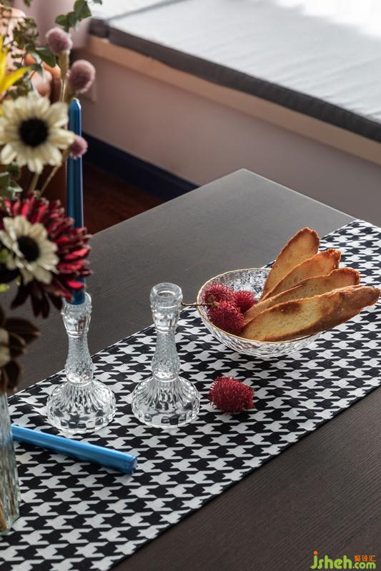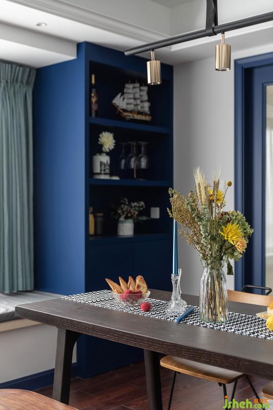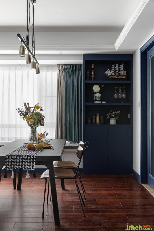 客餐厅开放式设计,使得空间视觉上得以延伸。简约餐桌椅,精心布置的桌面、装饰柜,多了些生活中的仪式感,大面积飘窗为空间增加采光度。