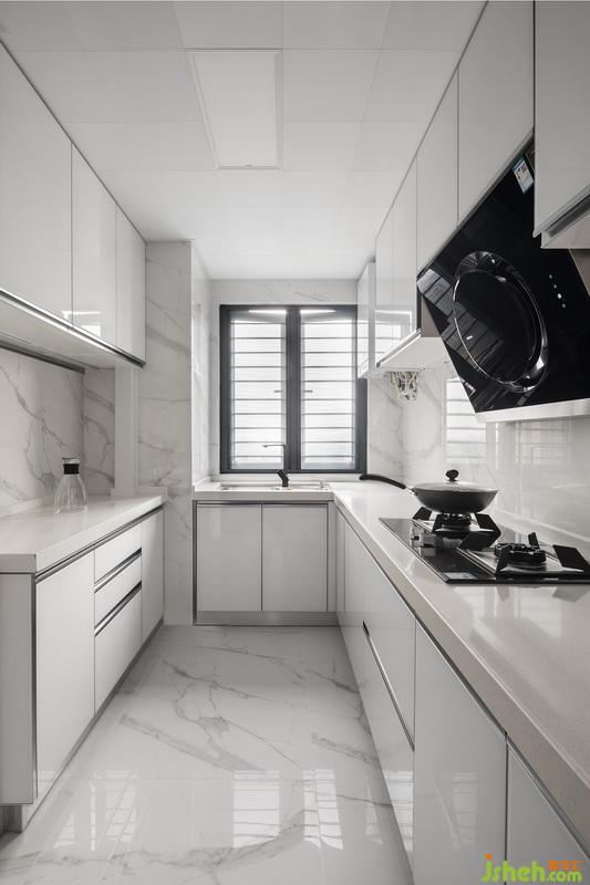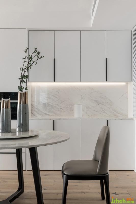 U型厨房,室内设计师合理的动线安排,让厨房更加人性化。白色橱柜搭配白色大理石,厨房拥有如此巨大收纳量的柜体看上去依然清爽明亮。