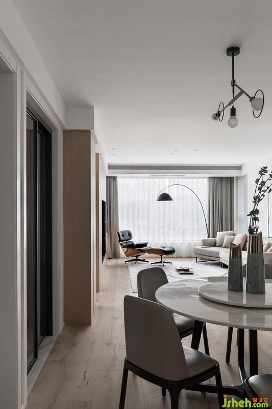 从客厅看向餐厅,一览无余的视角拓宽了视觉空间,让室内层次分明,没有一丝压抑感,自由舒畅。原厨房隔墙拆除换成推拉式玻璃门,保证餐厅里光线以及空气的流通。餐厅以白色为基础色,简约吊灯配以大理石餐桌和灰色餐桌椅,增加空间的质感。