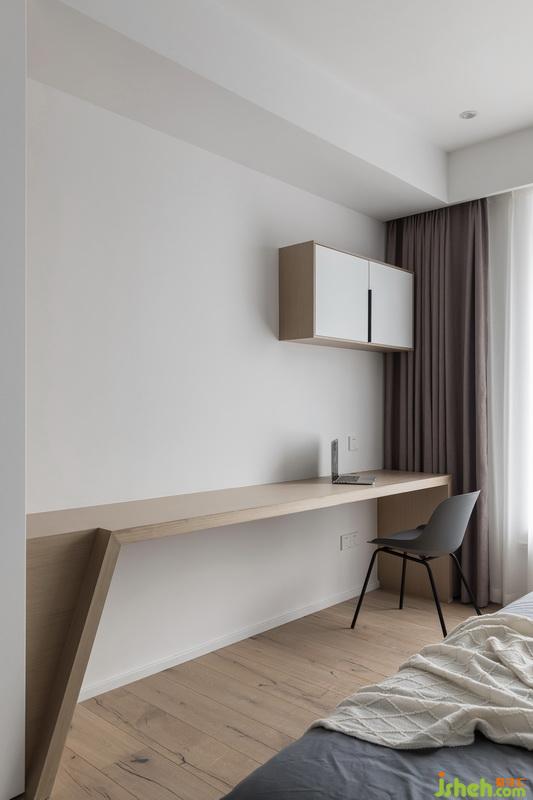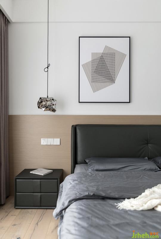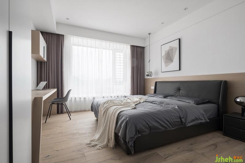主卧是夫妻俩的私人空间,整个空间以饱和度较低的色调为基底,室内设计师使用大量的木质材质,如地板、桌子与护墙板,搭配黑色、灰色床与床品,时尚不失简约。大窗户良好的采光为室内营造出洁净温暖的视觉感受。