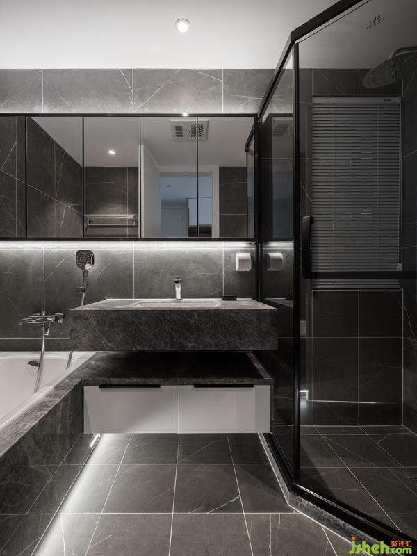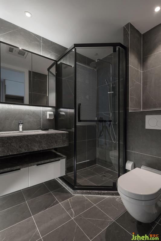 采用灰色大理石纹瓷砖,配上恰到好处的灯源,增加空间的高级感。浴室柜采用镜面的设计,淋浴房推拉门的运用也节省了不少空间。