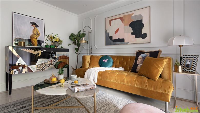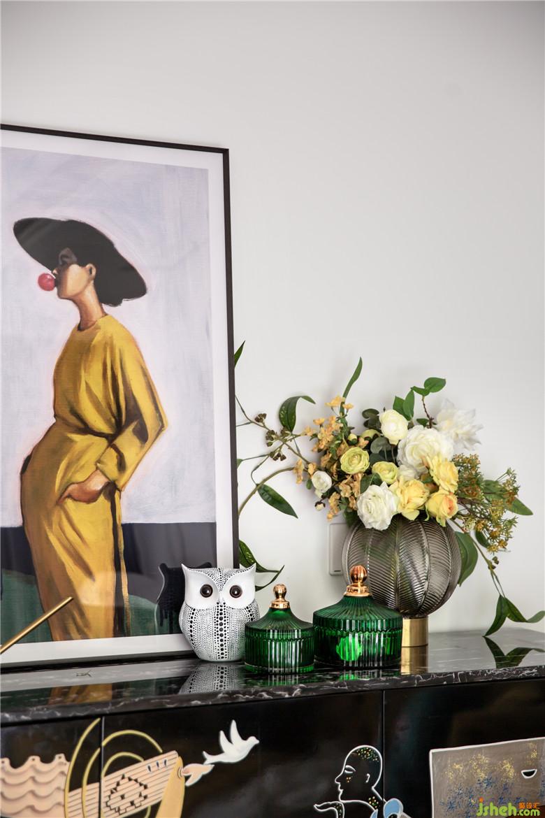 边柜让空间摩登个性,黄色装饰画与黄色沙发产生了呼应,精致的插花与小摆件,增添生活情调。原木色的地板、明黄色的沙发靠垫、以及边桌上金色的装饰摆件,都为这一空间增加了亮点,色彩鲜明得可谓恰到好处。