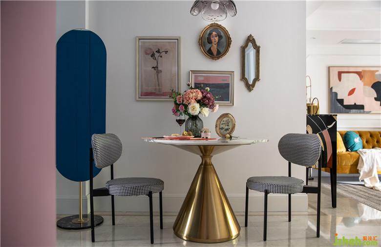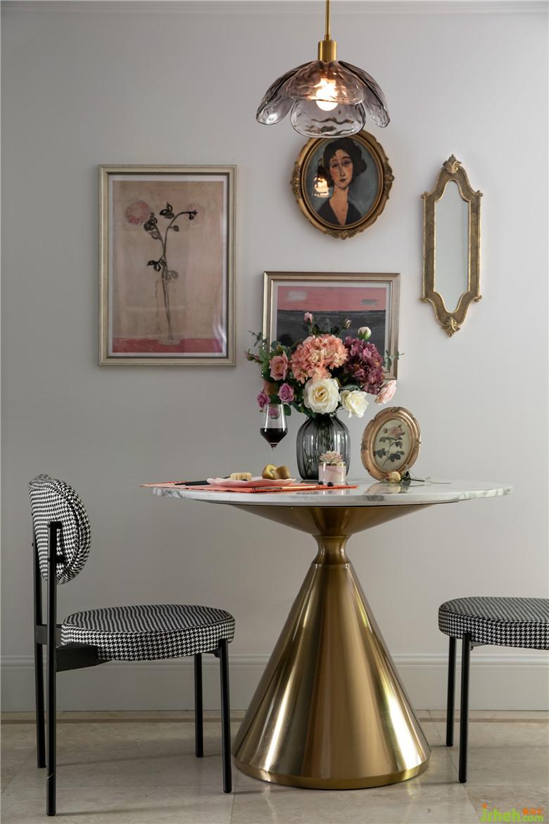 精致的生活很简单,赋予日常生活仪式感,享受过程,对待生活的每一处细节越是用心、认真,内心越会满足。干净漂亮的餐厅,金属与大理石结合的餐桌,各种颜色的插花与组装画,作为空间的点缀,并提升整体空间的层次感。