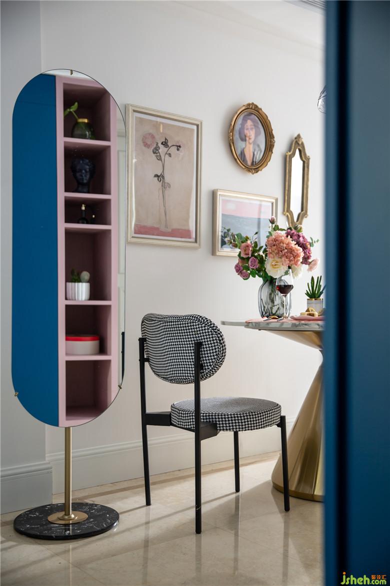 餐桌边上的穿衣镜,背后还可以挂放衣服,美观与实用并存。