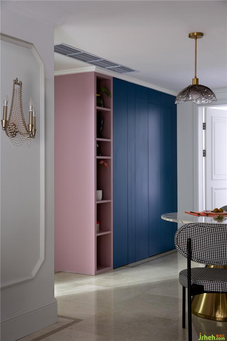 风水大忌厨房门对应入户门,把厨房门改成的隐形门,这样一进门就是蓝色的背景和粉色开放餐边柜。