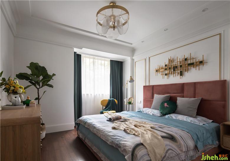 卧室的改造依旧是拆除了墙纸后做线条,和客厅不同的细节之处是多加了金属线条做装饰,搭配墙面金色挂饰有种不一样的时尚感,墨绿色窗帘与皮粉色床头软靠撞色的处理十分惊艳。