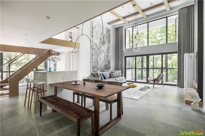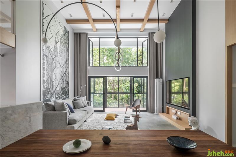 室内设计师采用充满设计感的灯具,利落的线条,使得空间配色上面更加的轻松自然,与窗外绿植相映成趣。