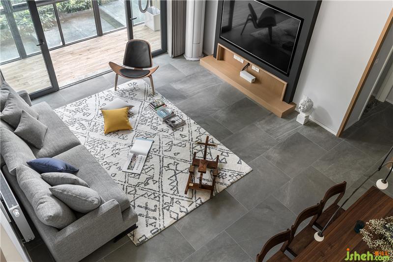在二楼以俯视的角度拍摄客厅全貌,灰色布艺沙发与北欧风地毯上,蓝黄色抱枕作为跳色活跃了整个空间。纯净的白与温润的木,成为室内主要的元素。足够的功能需求,为全家人营造舒适的生活环境。