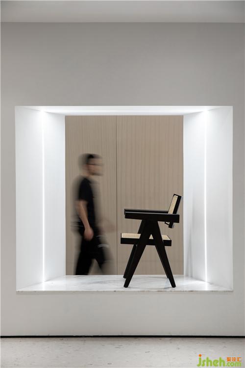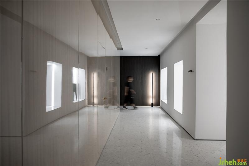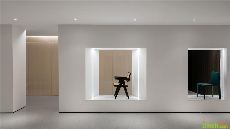 After the spatial positioning is determined, we hope that each area is different so that people can enter each space with a different personal experience. The first problem with the entrance of the exhibition hall is that there are too few light sources. We installed a row of light strips on the top wall to make up for the lack of indoor light. The side corridor is narrow and adjacent to the central exhibition hall. The two irregular trapezoidal windows reduce the sense of depression. They can also be used as display windows to display the latest themed furniture and connect the scenery of the two spaces.
