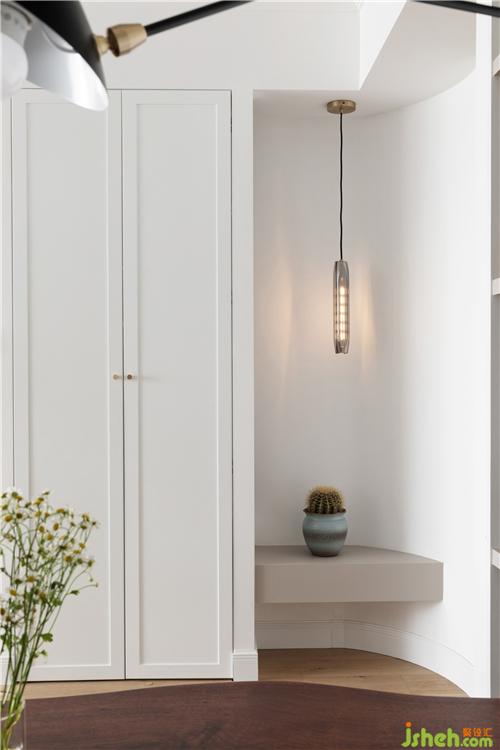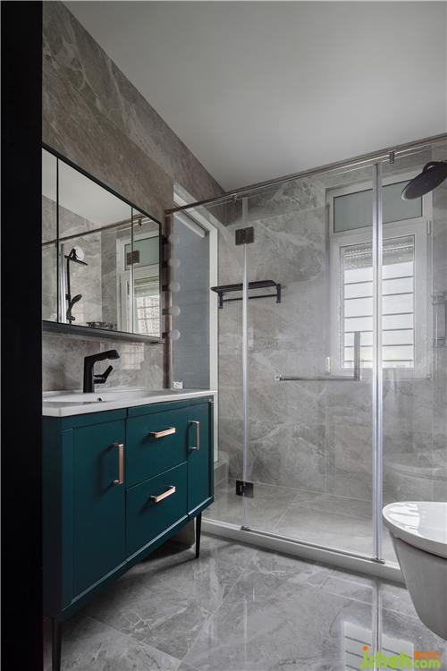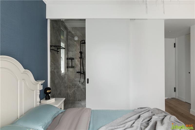 主卧内的卫生间除了设置玻璃隔墙外,还增加了移门给空间更多的互动串联。玻璃隔墙的设计,光线和空间的高纬度融合,在视觉与感官上得到一种平衡,移门的设定,在开启与关闭的形态下,完成多过个生活场景的转换,也为空间增添了趣味性。室内设计师