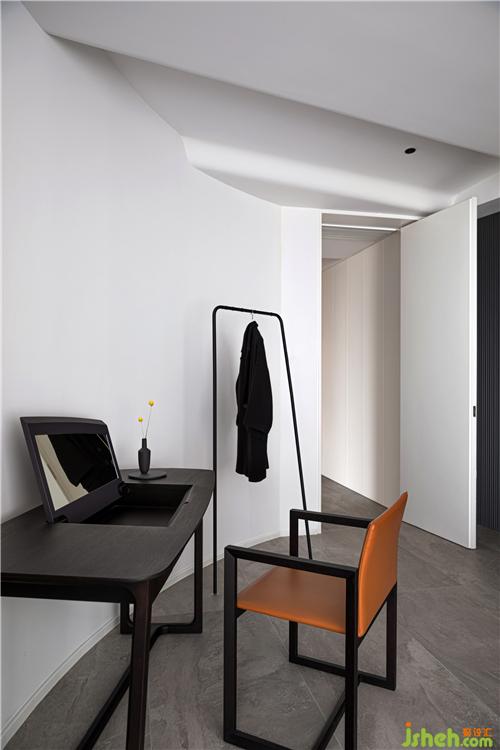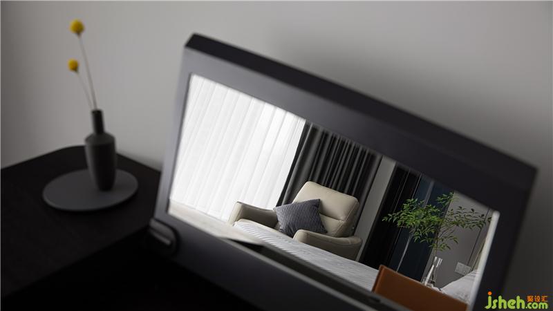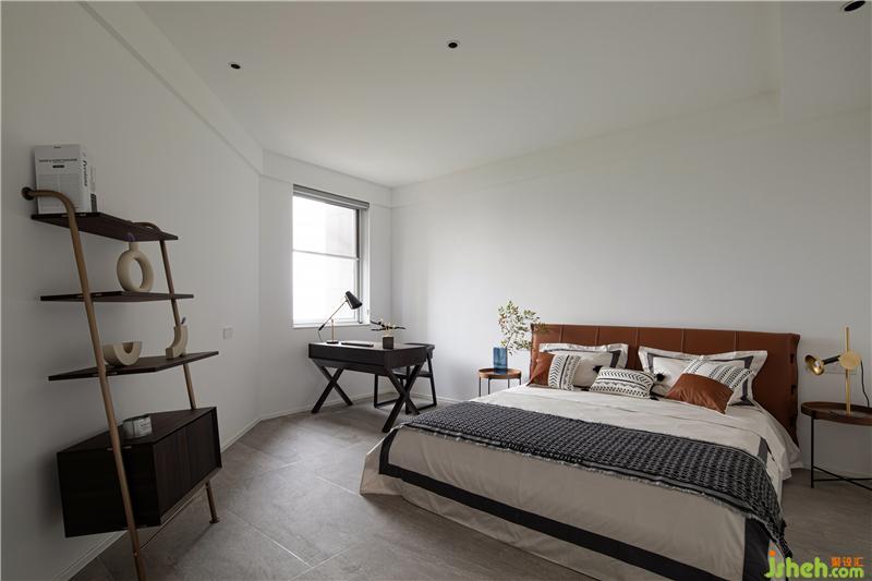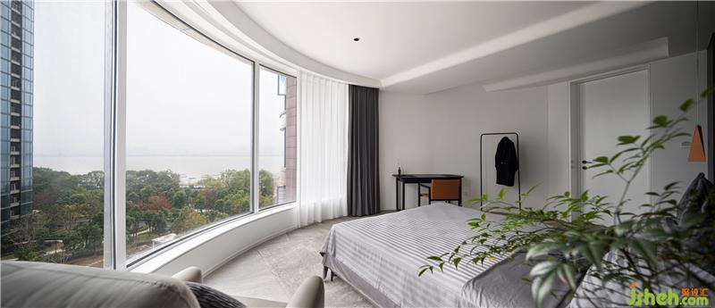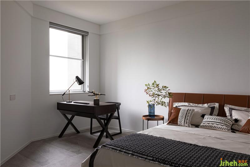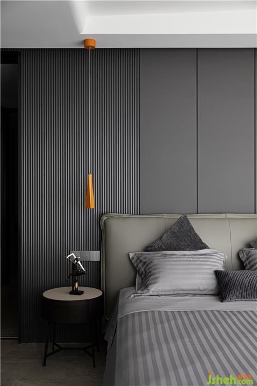 主卧延续了深灰色的基调,床靠背景墙采用灰色波浪饰面板,杭州装修设计整个空间沉稳。