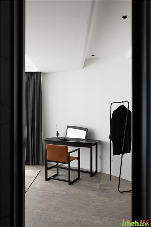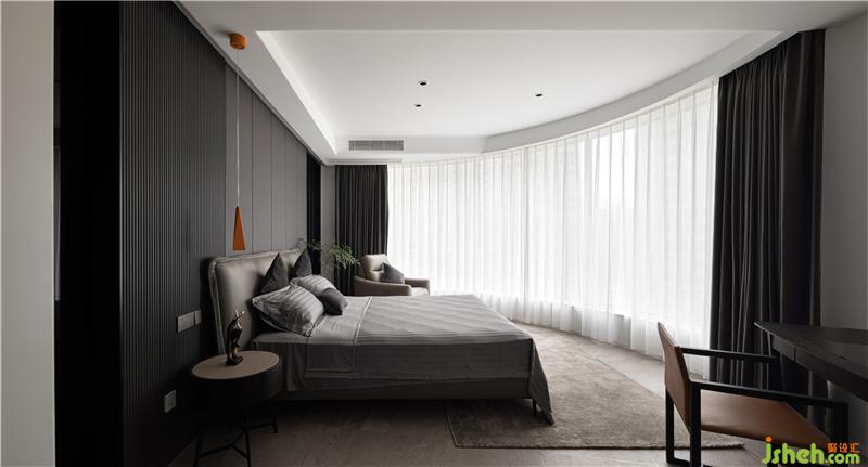 The master bedroom continues the dark gray tone, and the bed against the background wall adopts gray wave veneer panels to make the entire space calm.