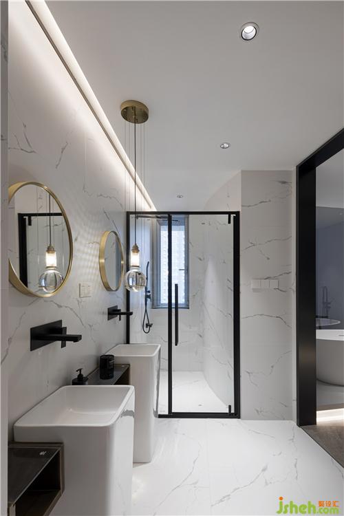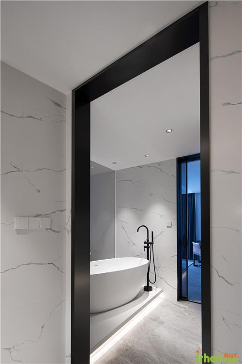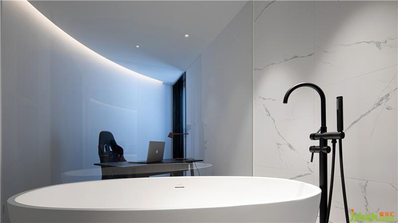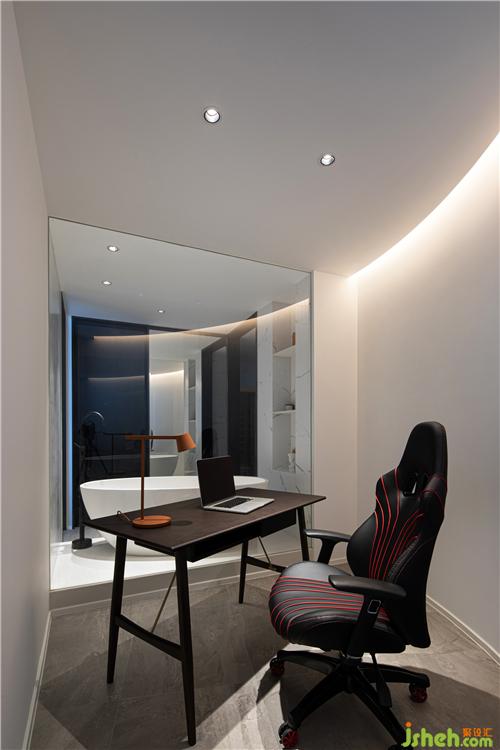 书房与浴缸也只有一“线”之隔,用玻璃隔断,将主卧室的所有功能间都串联起来,增大视觉空间。