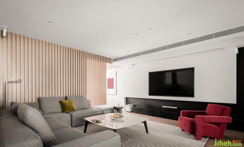 采用红色沙发作为跳色,给人感觉犹如是大自然中的一抹红光,为客厅增添了温暖的舒适感。