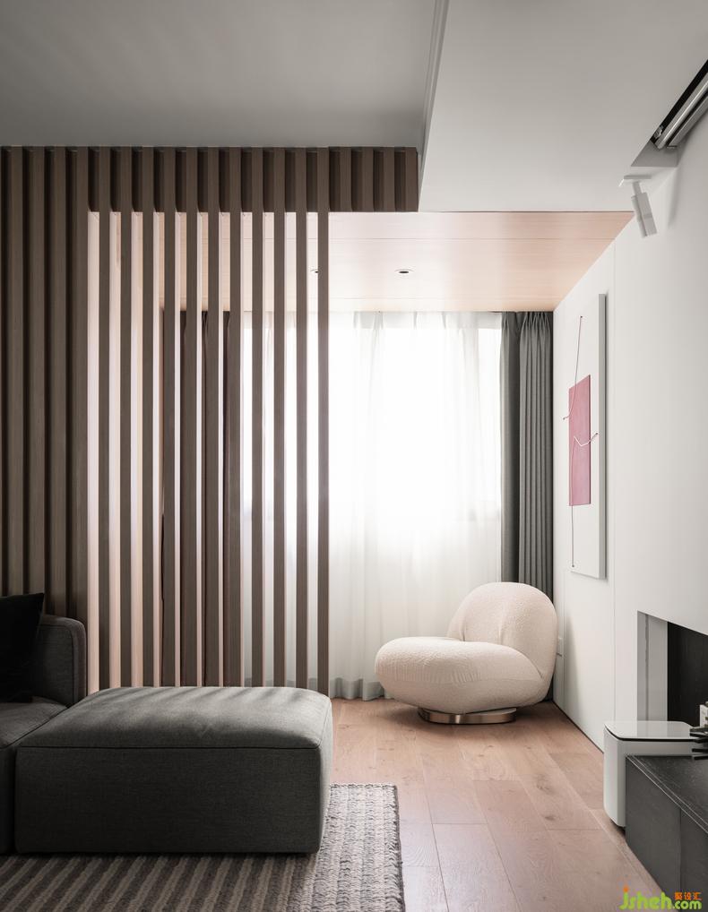 客厅与休闲阳台之间没有用传统的玻璃移门遮住它,装修设计而是采用木格栅的设计手法,增加光影效果,保证空间的通透性,让整个空间享受着阳光的抚摸。
