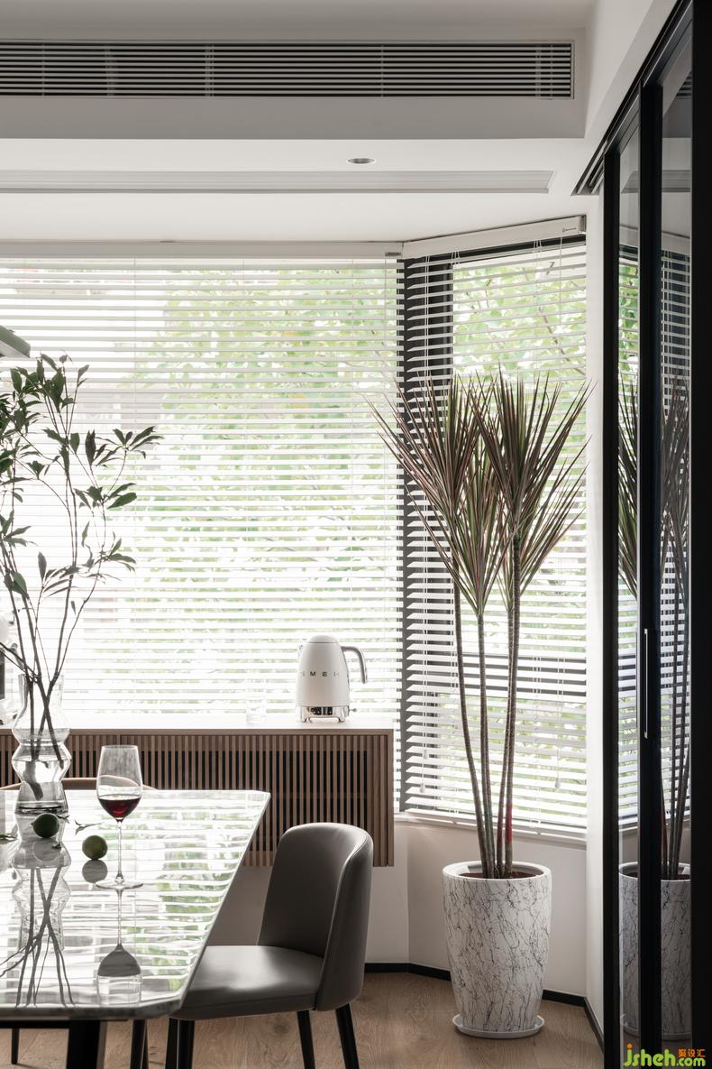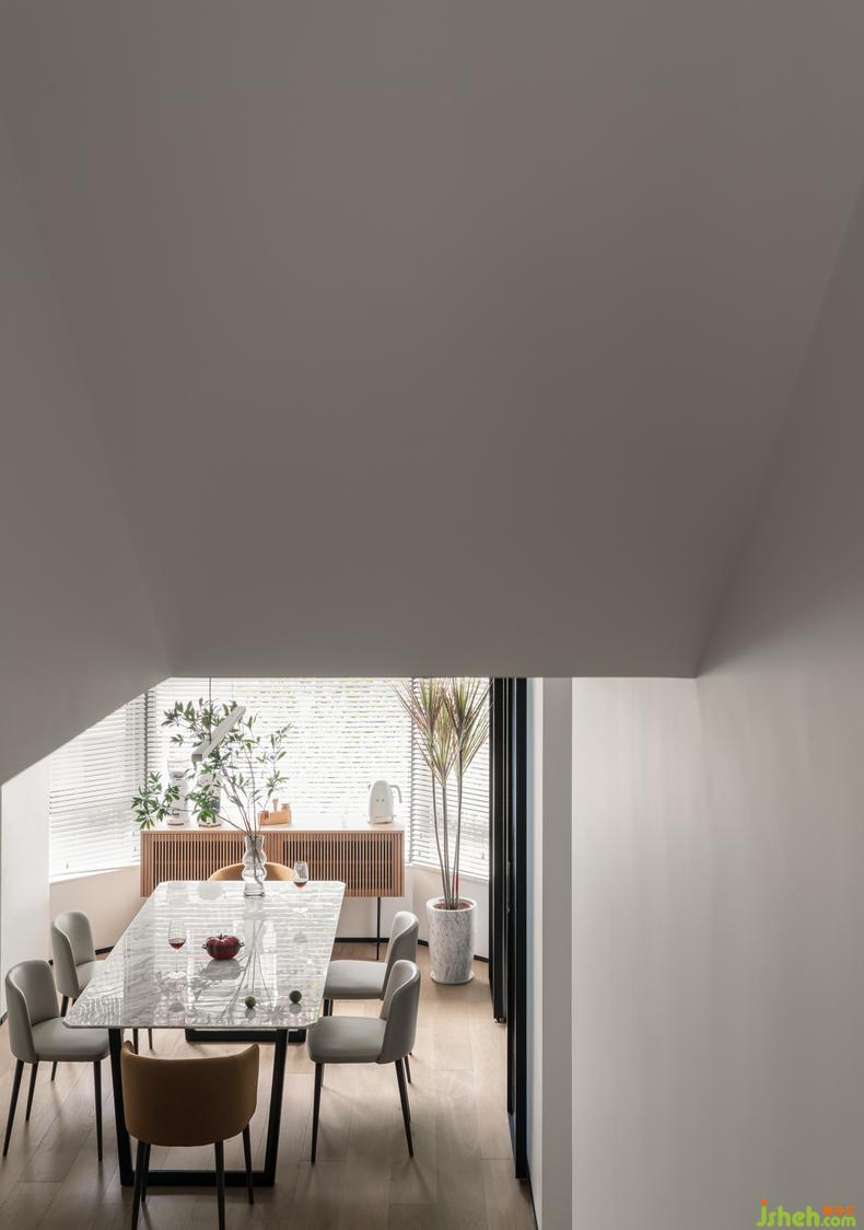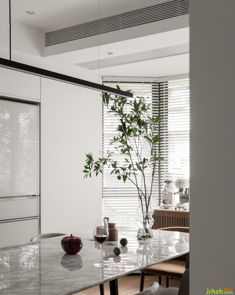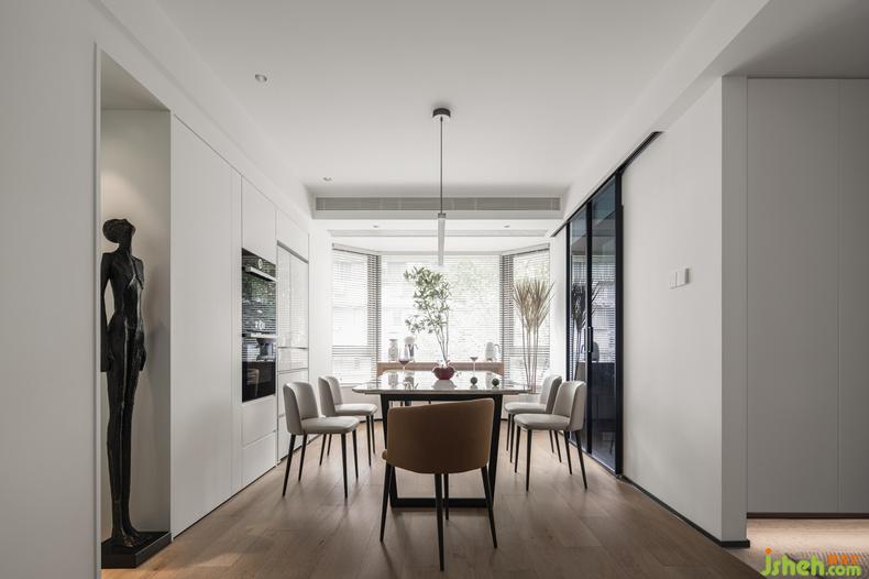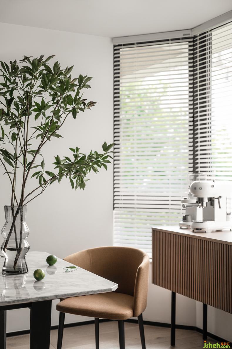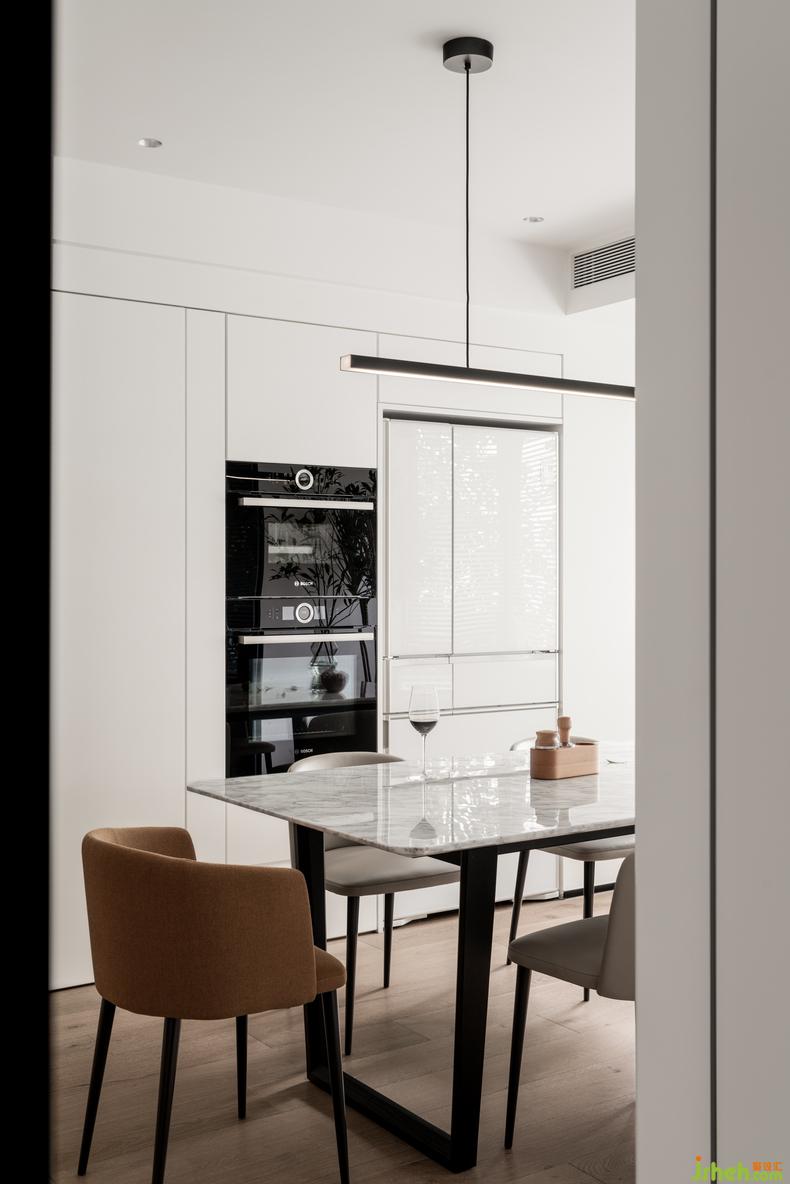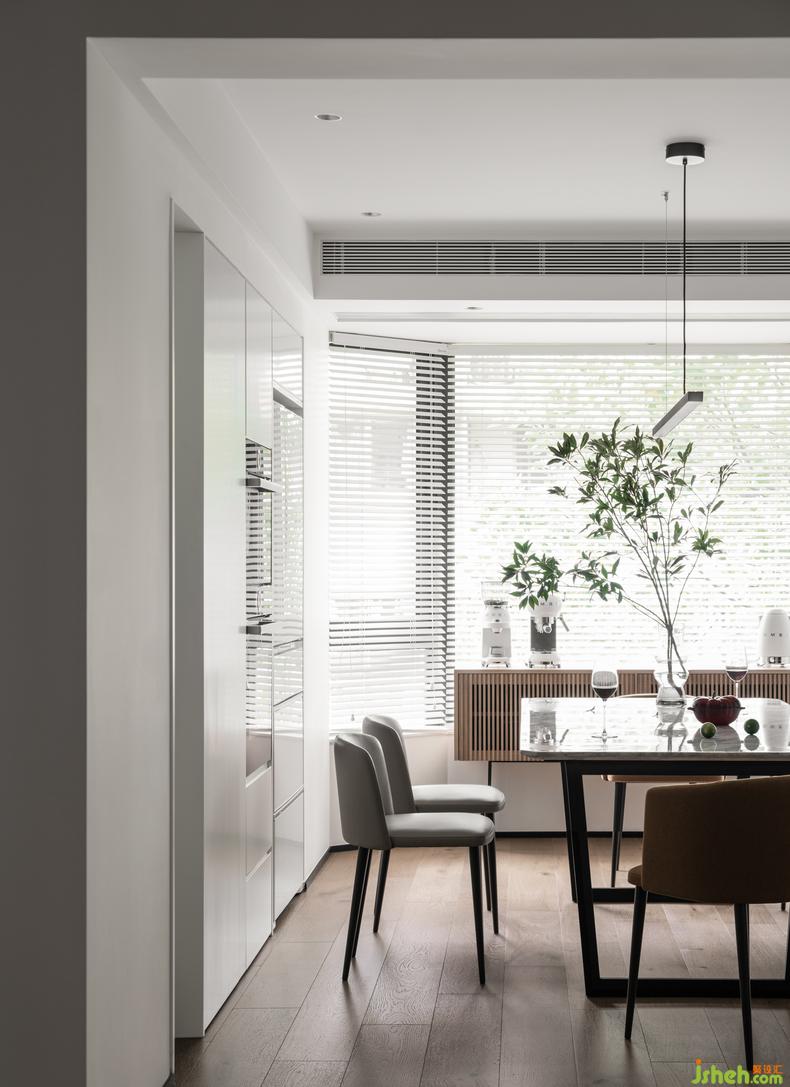 餐厅与书房的公共墙面,原本是中规中矩的齐平,装修设计设计师在这里将墙体设计成U形,凹进去的一面作为餐厅的储物柜和厨房蒸烤箱位置的考虑,满足厨房的功能与展示的需求