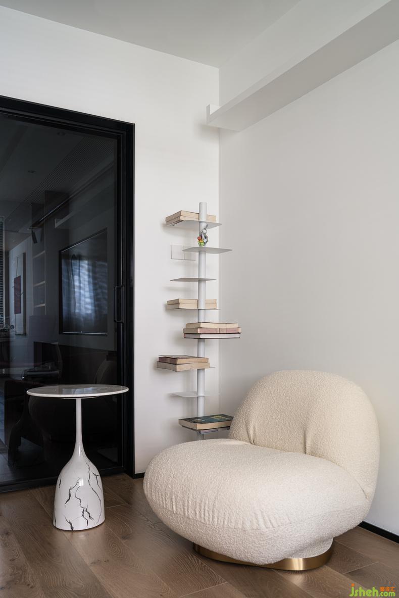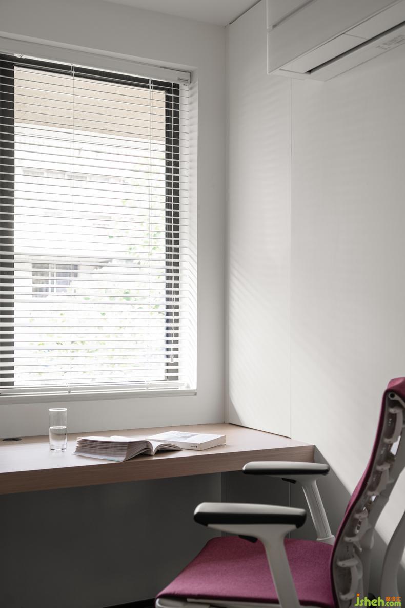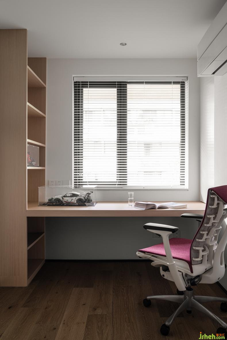 书房原本只有一扇窗户,采光受到了局限,设计师将墙体改用成玻璃移门,装修设计将客厅的光线延伸至书房,这样书房和客厅不仅光线互通,还有了互动,动线和静线相互结合。