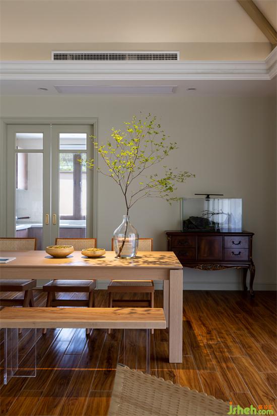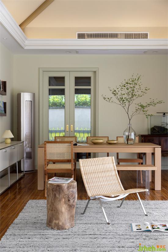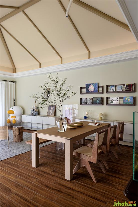 餐厅搭配的是原木风餐桌椅,搭配绿色苔藓和吊钟,仿佛置身在大自然中享受美食。