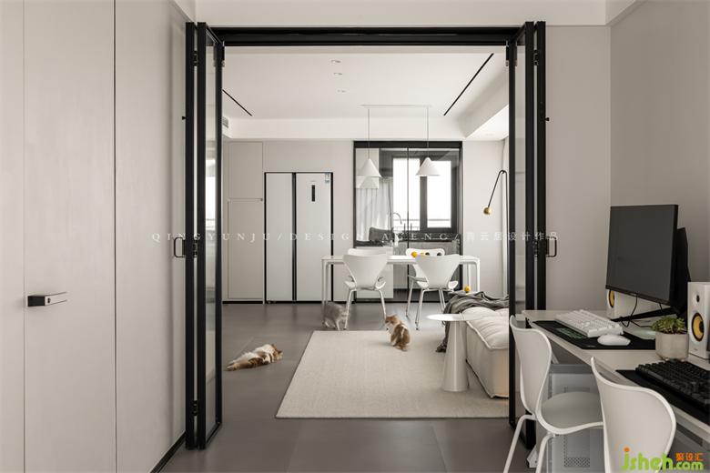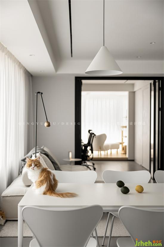 When the sliding door of the entertainment area is opened, the dining room and the leisure area are integrated, and two people and three cats can play to their heart's content; when the sliding door is closed, it becomes a private master bedroom large suite.