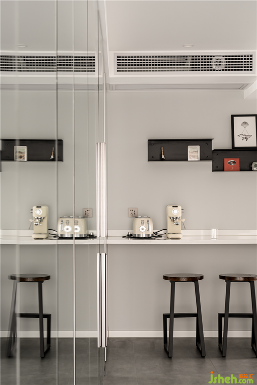 吧台:水吧台是放置一些咖啡机和面包机等小电器,墙面错层的置物架,可以满足随手拿取水杯及物品。