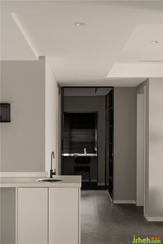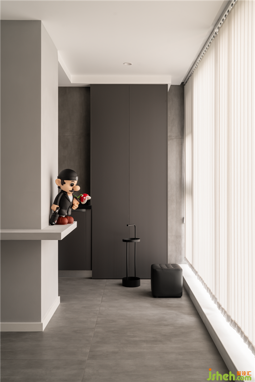 过道:地面运用的是微水泥地砖,深灰色置顶柜与落地窗形成自然的光影效果。