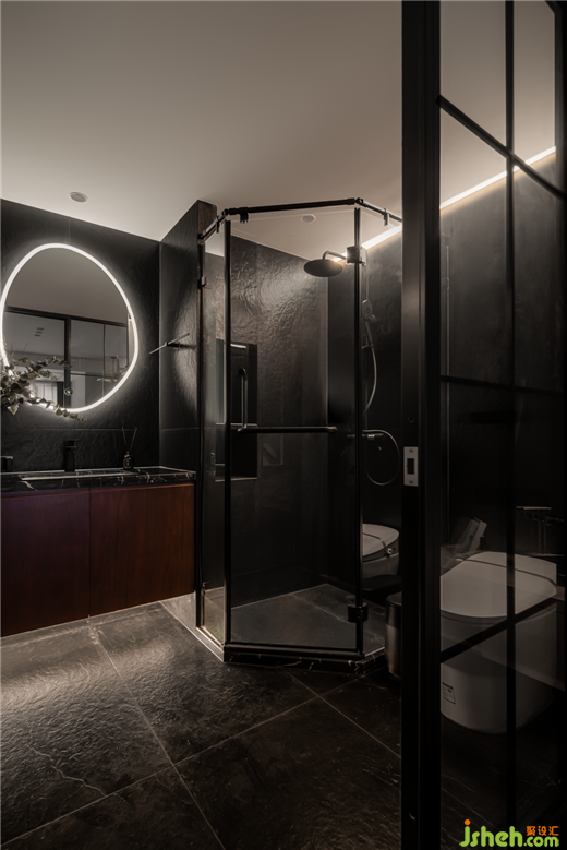 卫生间:采用黑色地砖+玻璃,工业与现代的碰撞,搭配整条灯带,高级感和氛围感同时拉满。