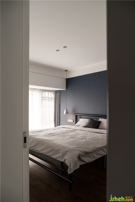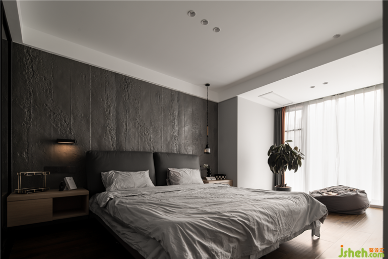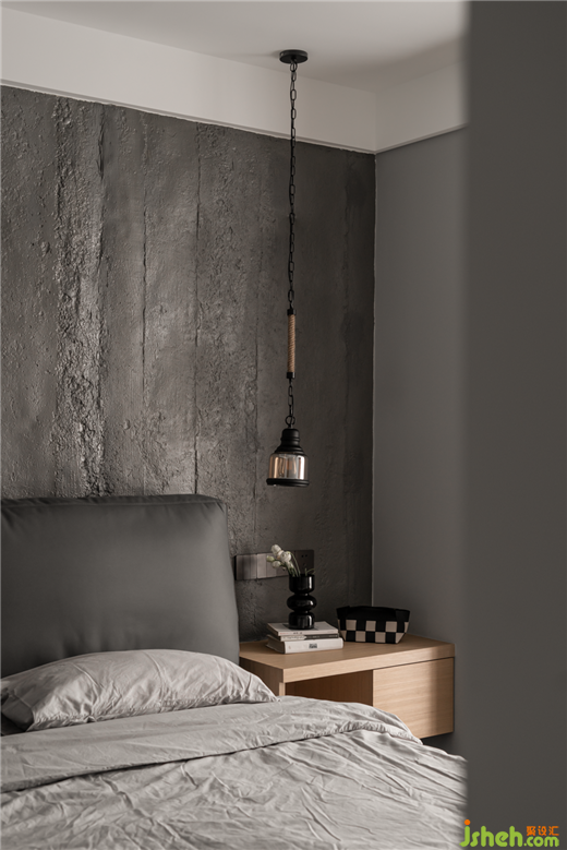 卧室:床头背景墙采用的是水泥板,色调相对较深,搭配原木地板,与定制的家具,素雅低调,打造出静谧的效果,让主人回到一个舒适的休憩空间。