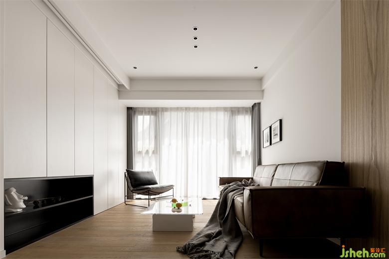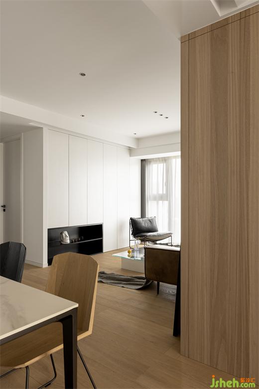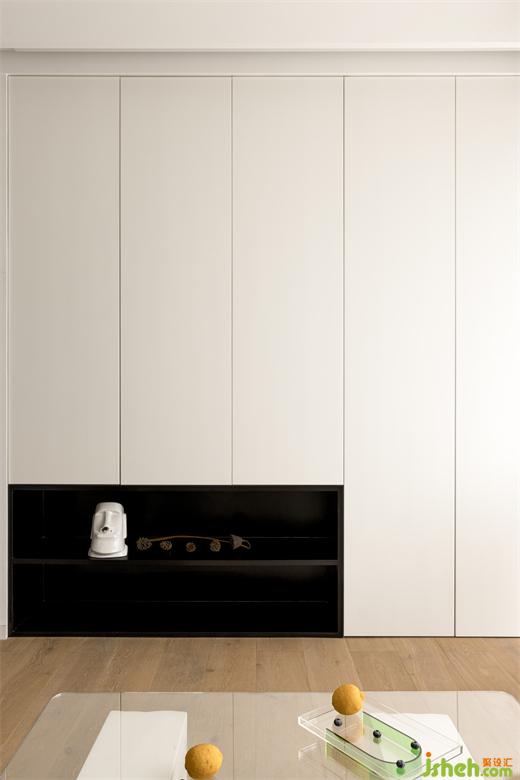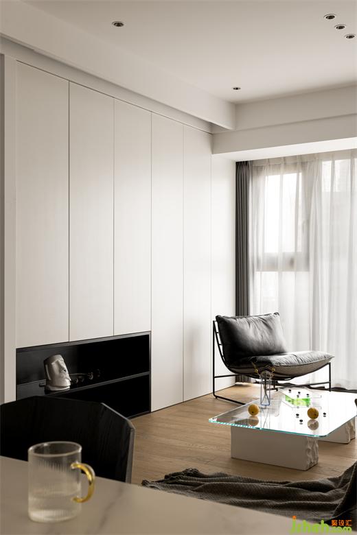 One wall of the living room is designed as a storage cabinet to facilitate the placement and storage of items in the home, and the cabinet door is closed to avoid falling ash, so that the cabinet and the living room look more unified. A groove is designed between the top of the cabinet and the ceiling to solve the placement of the projection screen, which is both beautiful and space-saving.