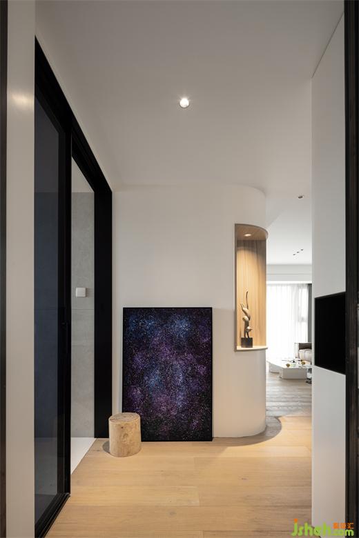 展示壁龛采用浅色木饰面,与地板相互呼应,摆放一件雕塑艺术品,杭州世贸之西湖家装设计搭配星空装饰画,和原木凳,超级有艺术感。