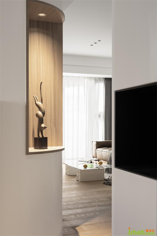 进门处的玄关设计~展示壁龛+鞋柜,美观与实用相结合。到家后先放缓心情,第一件事换上拖鞋,走到沙发上,“葛优躺”,松散舒适~