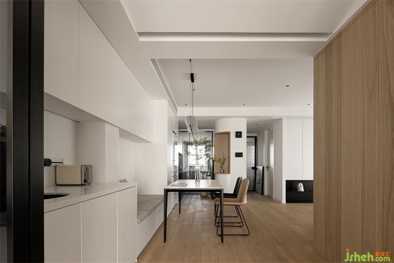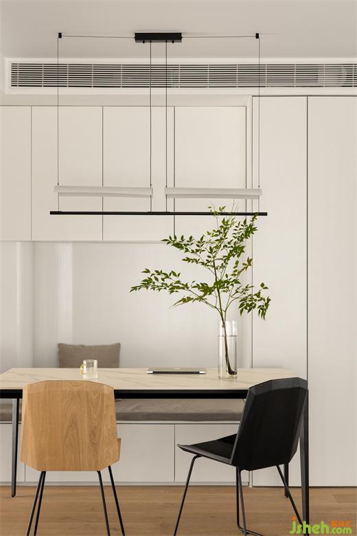 餐厅的另外一边设计的是一体柜式座椅,优化了餐厅的空间,杭州世贸之西湖家装设计整体设计空间更加融合。
