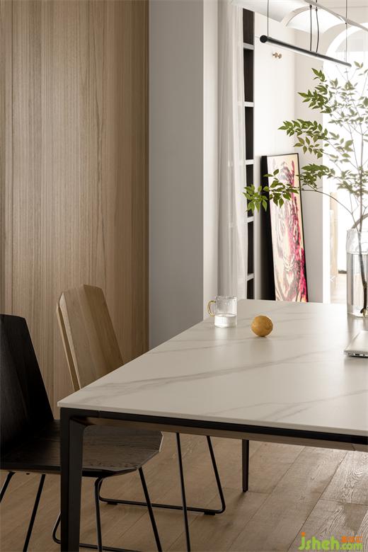 木质地板,整体有种在大自然中的感觉,再搭配绿植吊钟,和简约吊灯,自然的光线打在餐桌上,杭州世贸之西湖家装设计整体环境显得格外清爽与温馨。