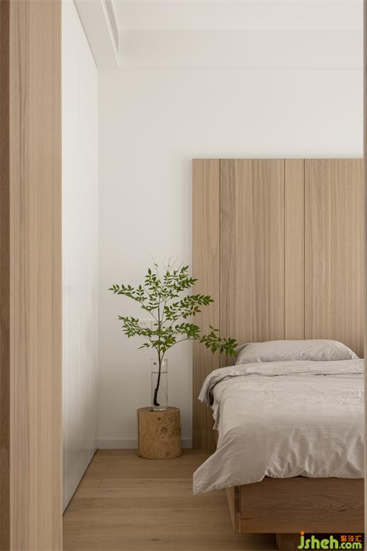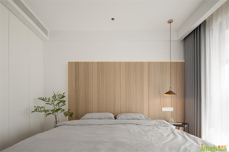 床头背景墙与地板色彩相呼应,杭州世贸之西湖家装设计搭配窗帘的浅灰色和纱帘,灵动富有生气,原木风设计总是能给人一种柔软舒适、优雅温馨的感觉,这也正是对家的向往。