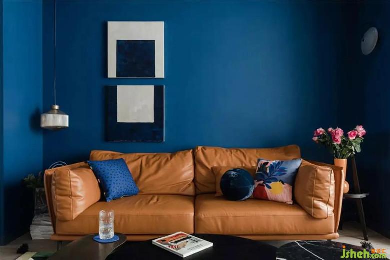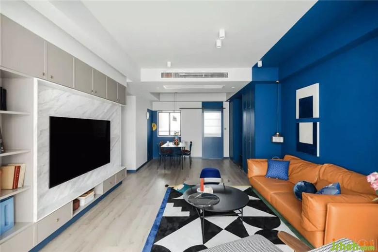 客厅墙面以克莱因蓝为底色,搭配浅灰色木地板,以及白色极简的顶面设计,整个空间是无限的,是充满容纳力的。