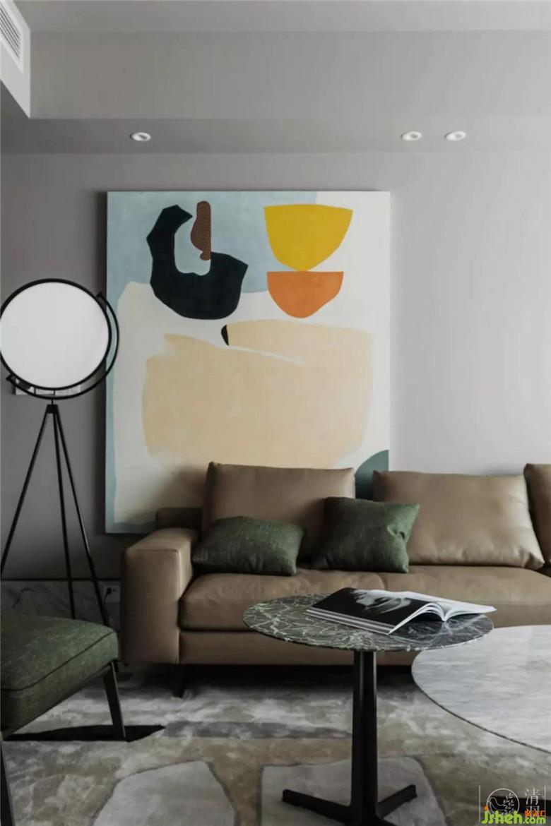 客厅的布局自由而放松,硬装是追求质感和极简的状态,家具是CAMERICH 锐驰的全套家具,深草绿的沙发椅、深卡其的皮质沙发、浅灰的墙面、珞黄的透明花瓶,配合大理石的自然纹理、木材的天然质感,整个客厅都散发着温暖且极具包容感的味道。