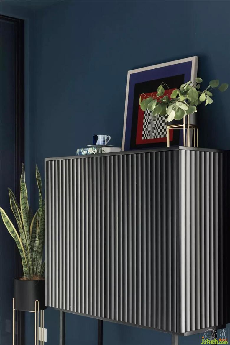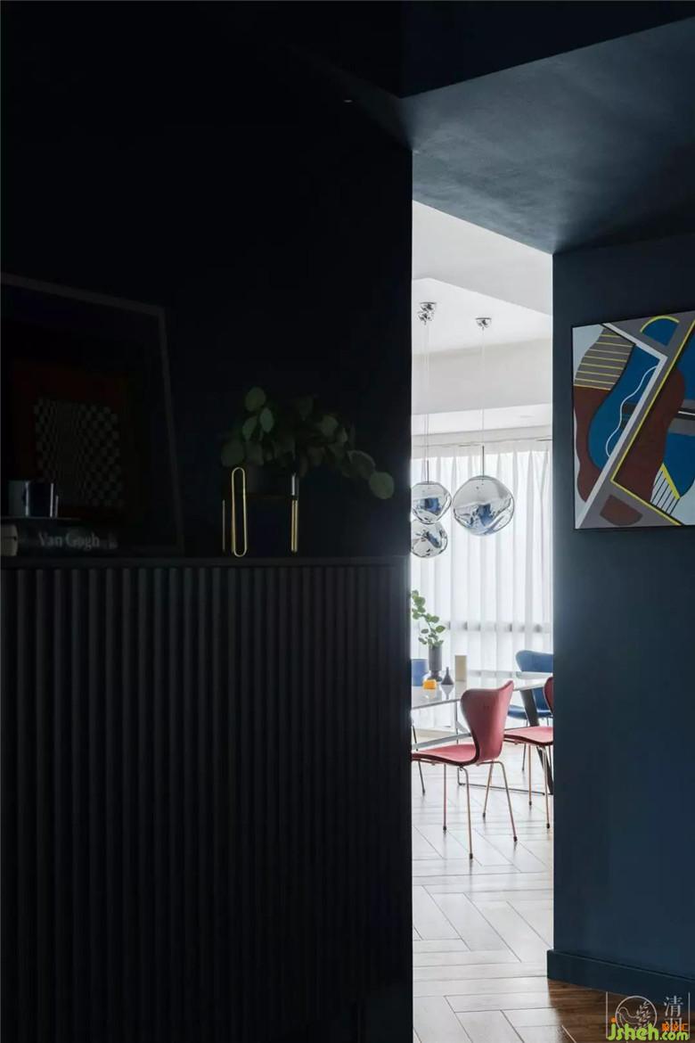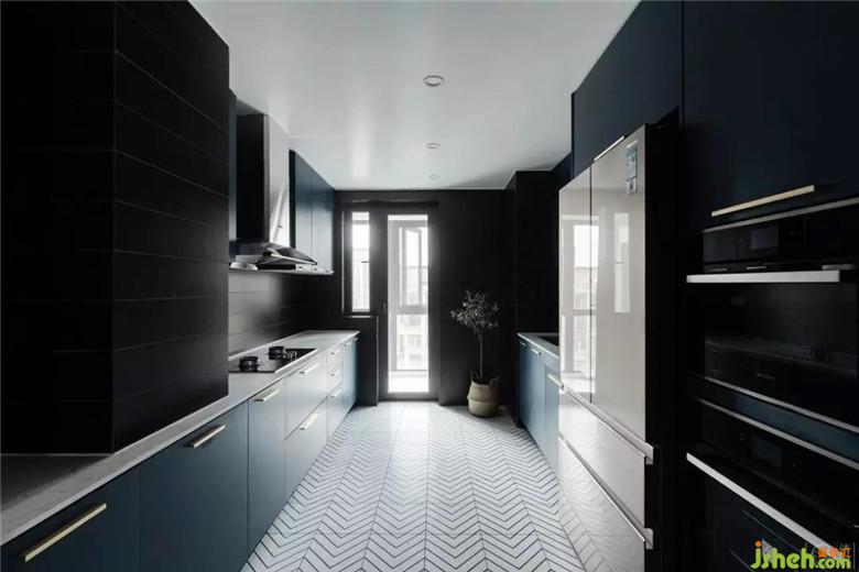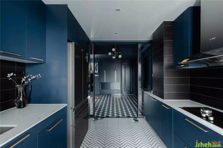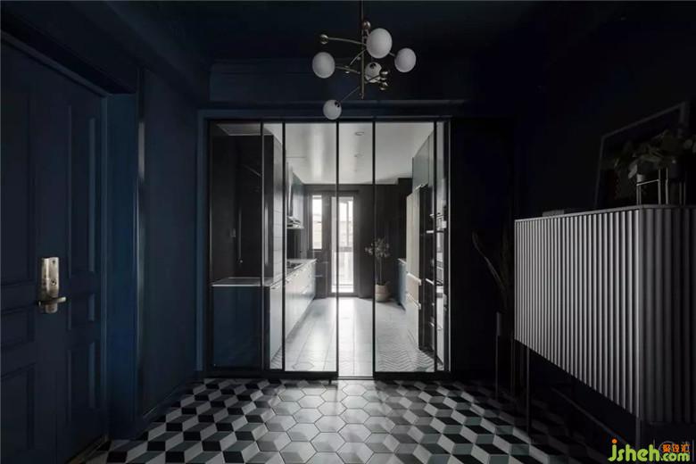 入户的地板延续到厨房,变幻出另一种别致极简的几何线条,用以调和墙面的深邃蓝与质感黑,玻璃推拉门保证光线通透和两个空间使用动线上的亲密关联。