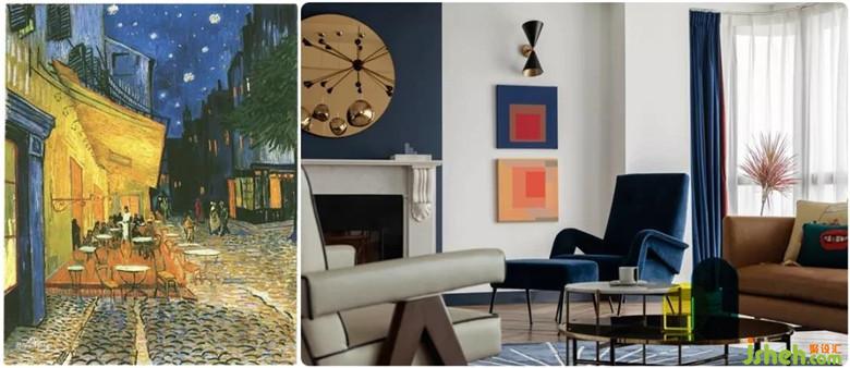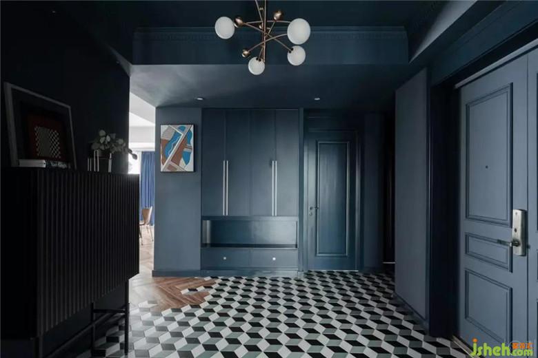 《罗纳河上的星夜》是一幅既亲近又茫远的风景画,这非常符合入户的功能和审美需求。我们在设计时大胆将深邃的蓝色上墙上顶,地面是浅绿深绿和白色的几何色块,并没有完全铺满,而是有意切割了到客厅的切口,呈现出奇妙的空间感受:既俏皮亲切又文艺傲娇。