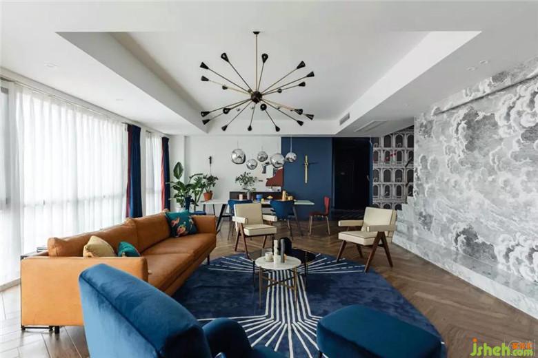 整个空间也被放大了,填满了蓝色,留白出了装饰面。金色和白色的流星造型吊灯是唯一的装饰,留白更多给想象力。