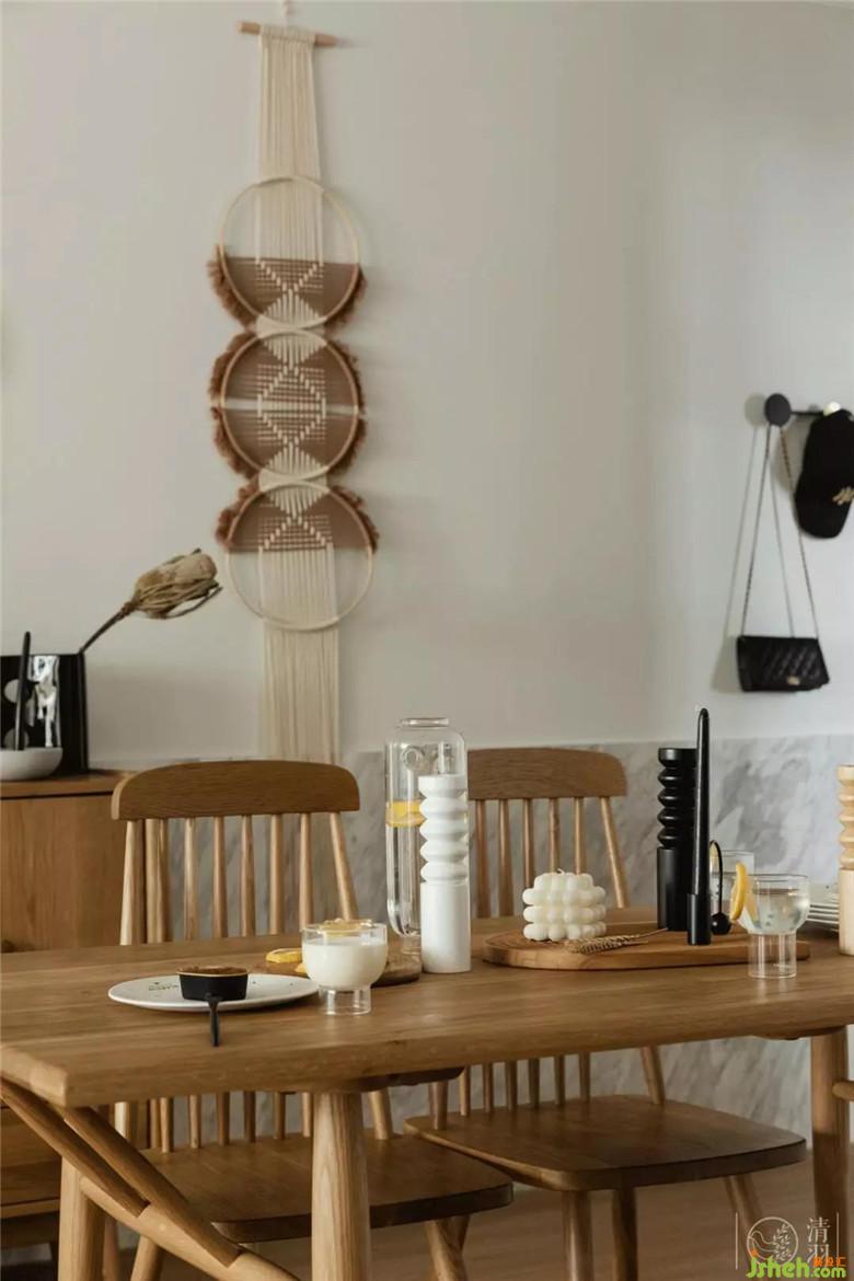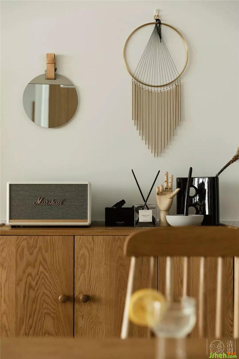 墙面的装饰选择与主色调同色系的编织品,降低整个空间中的冲突感。