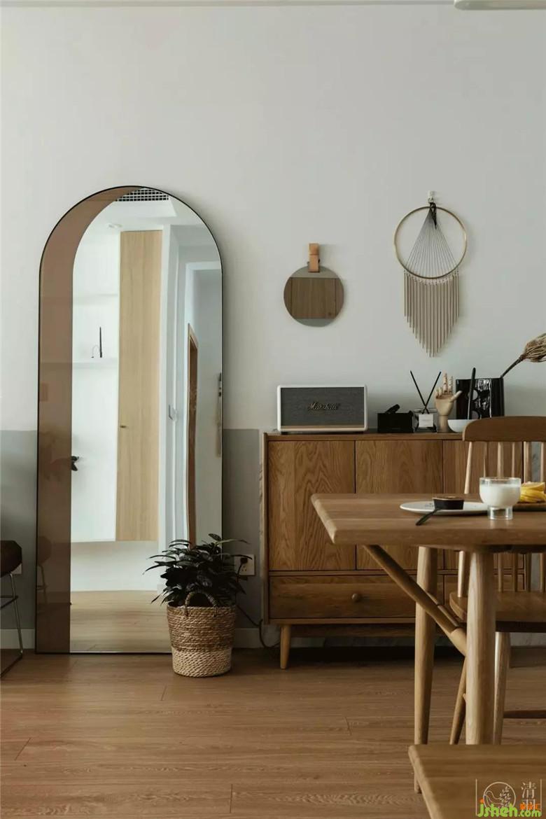 我们在餐厅与客厅之间放了一面有设计感的镜子,折射两边的景象,像打开了另一个空间的门,也为两个空间建立了有意思的连接。