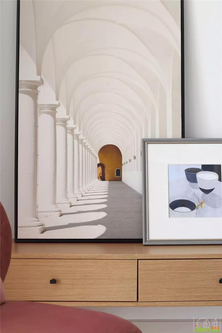 装饰画选用了立体感强的图案,打破了白墙的单调。