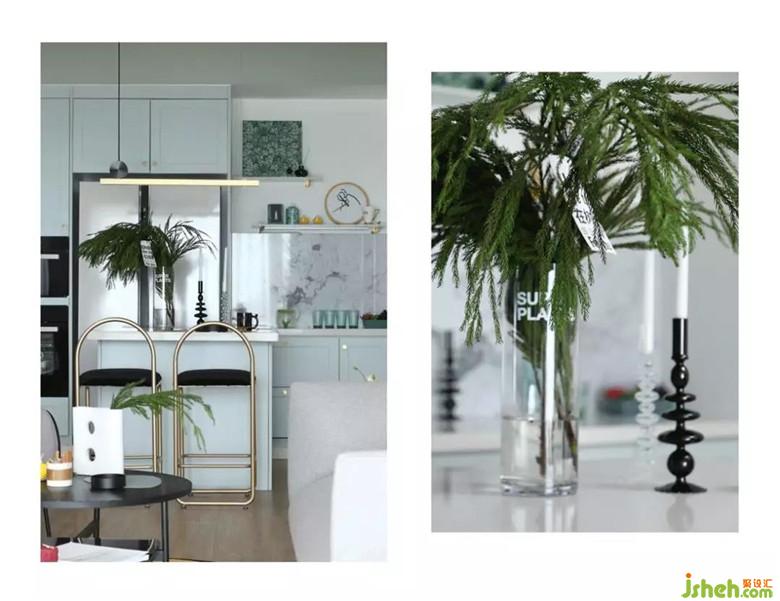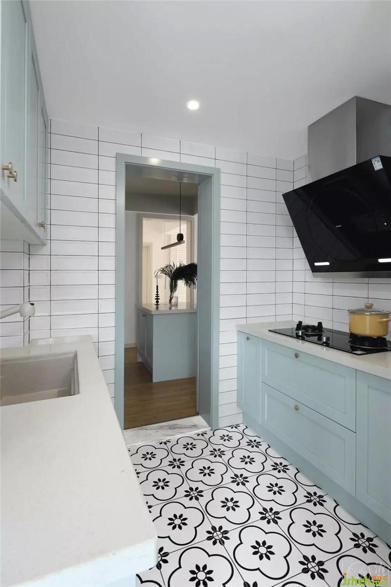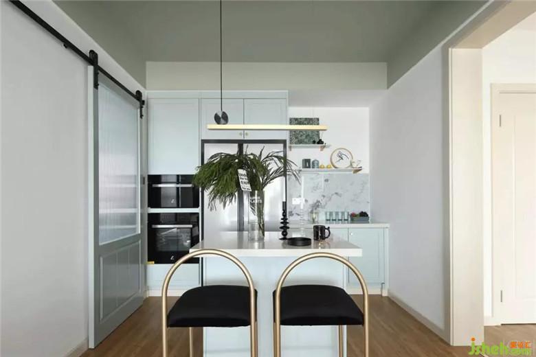 西厨区是穗穗一直想要的,在这里可以吃吃早餐,喝喝咖啡,做一份自己喜欢的晚餐。我们还在西厨区的顶面做了拼色,这样和客厅的拼色做了一个呼应,让整个空间有了呼应,更加统一和谐。