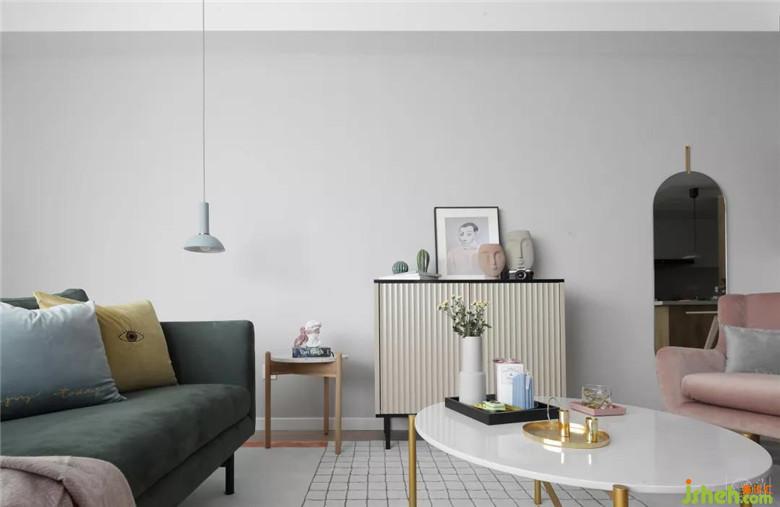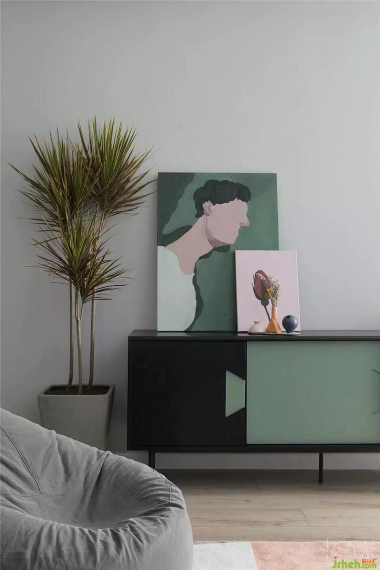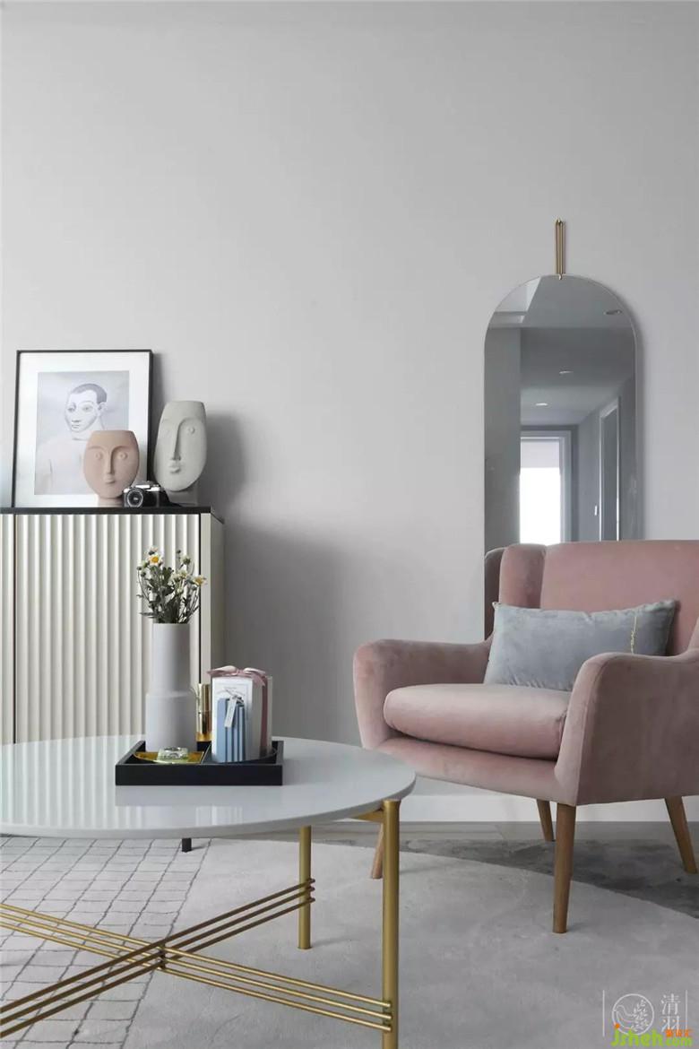 房子的整体采光都很好,我们也尽量的保留大部分的格局不变,让自然光线可以撒满整个屋子。因为厨房的格局与采光较弱,所以改动较大,厨房改为开放式的布局,增加吧台与收纳的空间。生活阳台则从卫生间通过,这样厨房的空间也通透明亮起来。而在色彩上,我们也是采用大面积的灰度色彩,搭配低饱和度色调的的家具,让整个房间通透而雅致,再用一些明亮颜色的配饰点缀其中,让空间充满趣味。