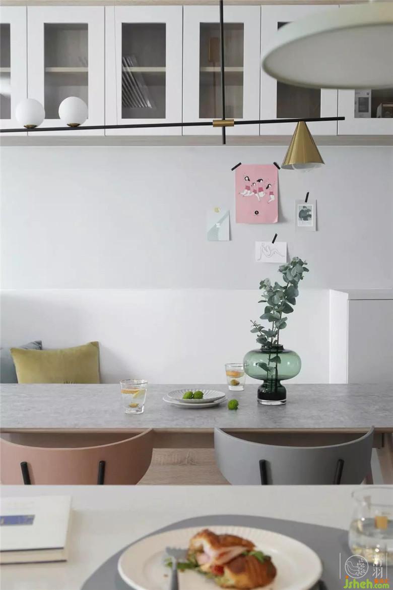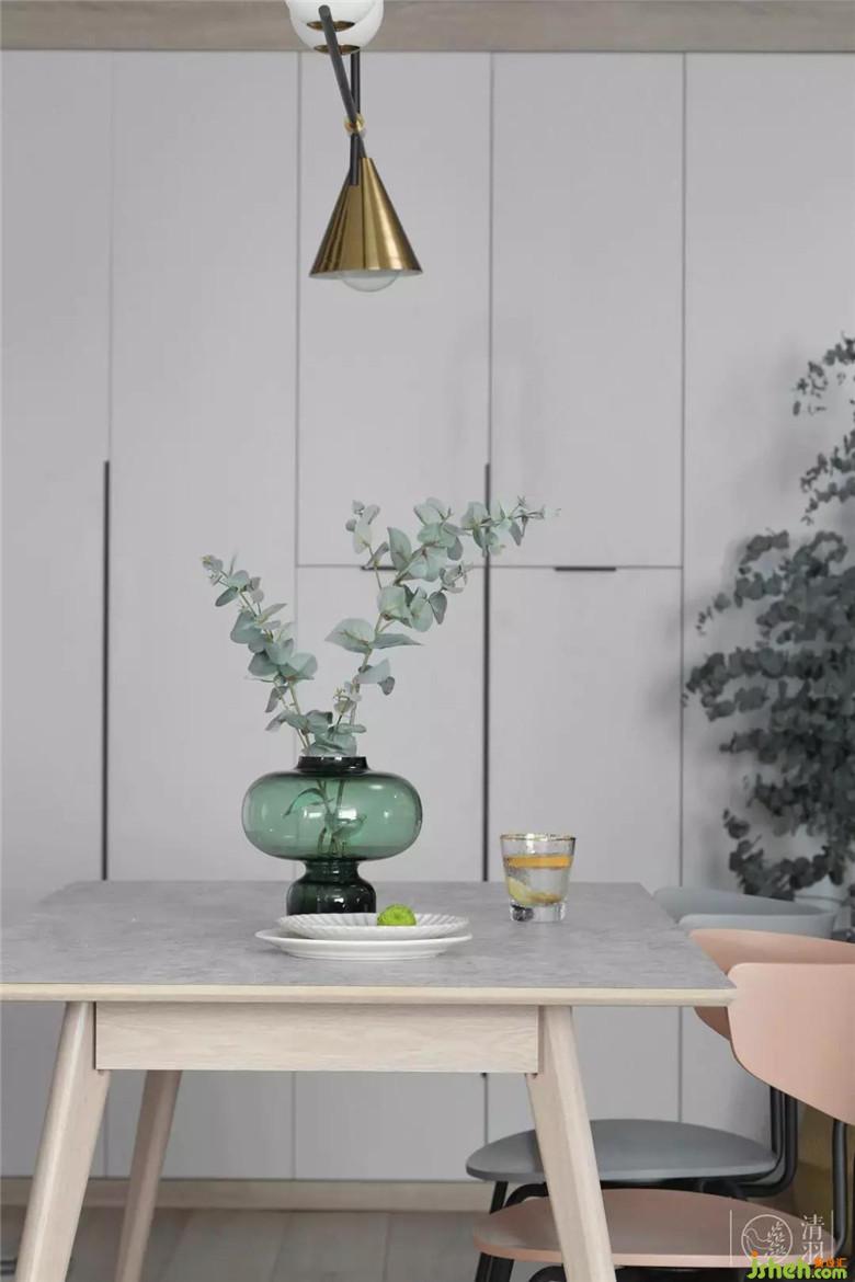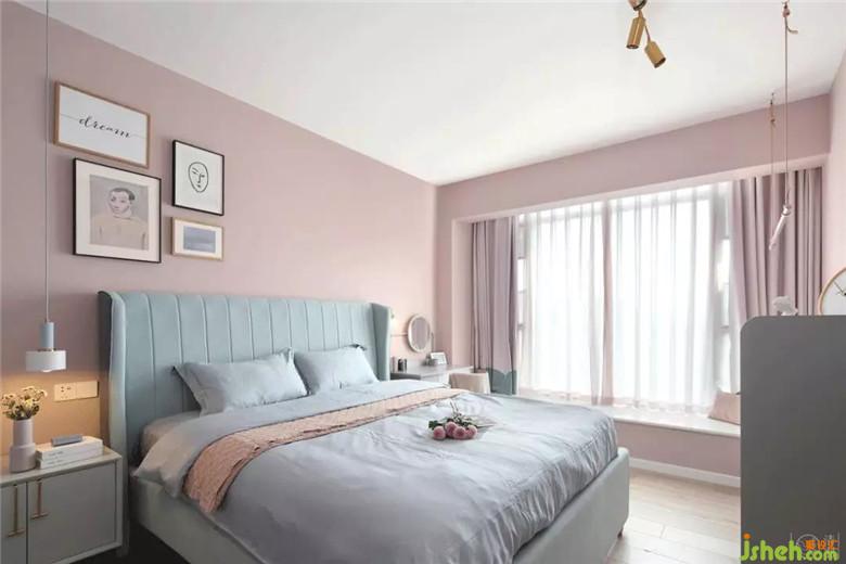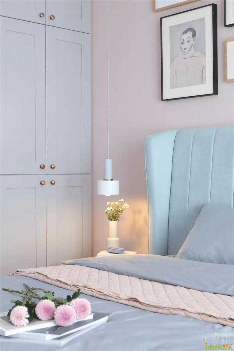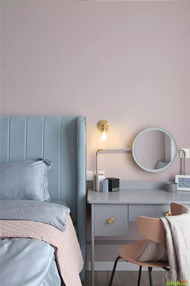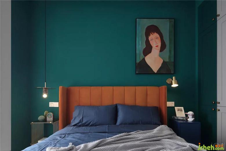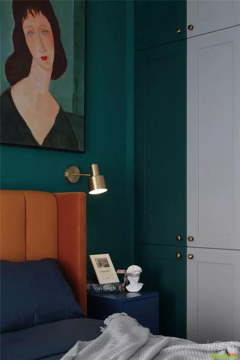 绿色墙面乳胶漆延伸到侧面衣柜,油漆颜色和墙面乳胶漆颜色高度统一,让背景墙有了围合感。