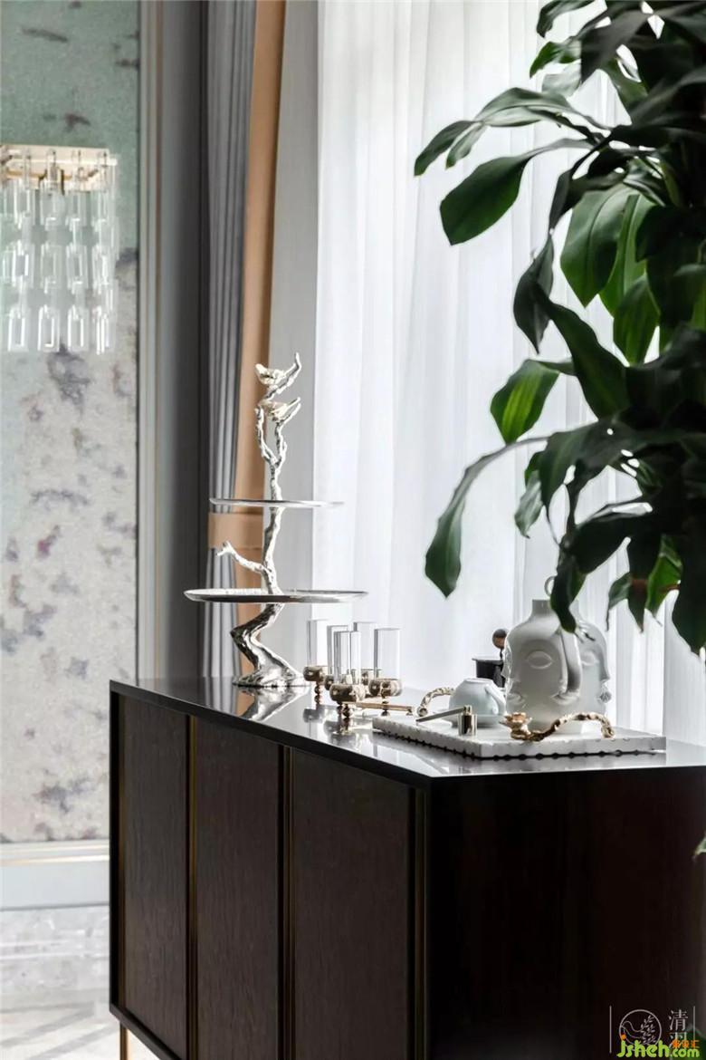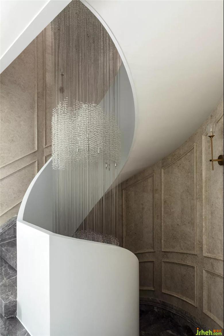 这一次的走廊、楼梯间,我们小心的打破陈规,采用旋转式楼梯加白色钢板流线型的扶手设计,由房屋内最高处坠下的瀑布式水晶灯贯穿其中,搭配深灰色的石材贴面旋转楼梯以营造出高级的梦幻感。既优雅知性,又梦幻得似有精灵穿过,就像屋主夫妇和乖巧的女儿们给人的第一印象。