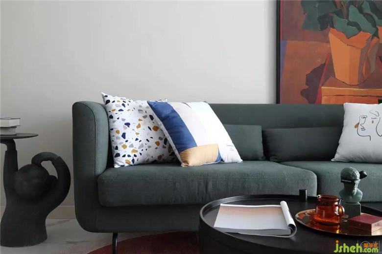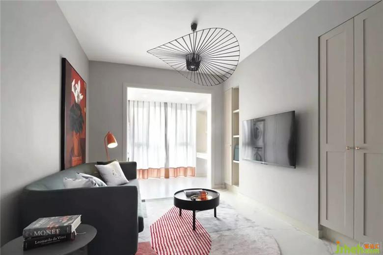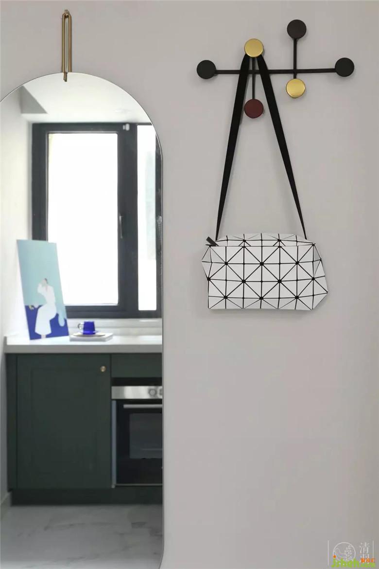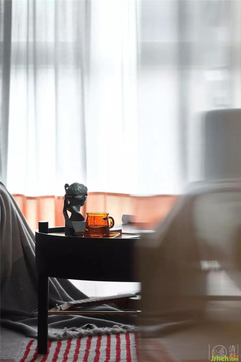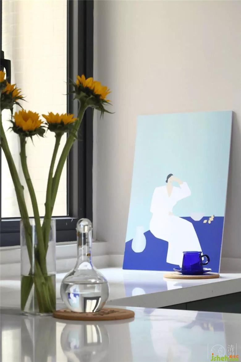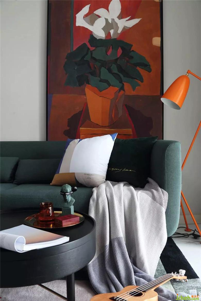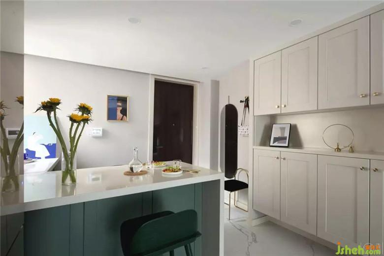 空间色彩的选择上,我们考虑整体素雅有致,局部使用了一些颜色点缀。吧台选用了灰湖绿,与墙体颜色搭配给人自然的亲切感,素雅中留给心中一片宁静的颜色。在最能代表个性的主卧空间选用了日落橙,与客厅的娴静形成对比,让空间感觉拥有变化、充满张力。