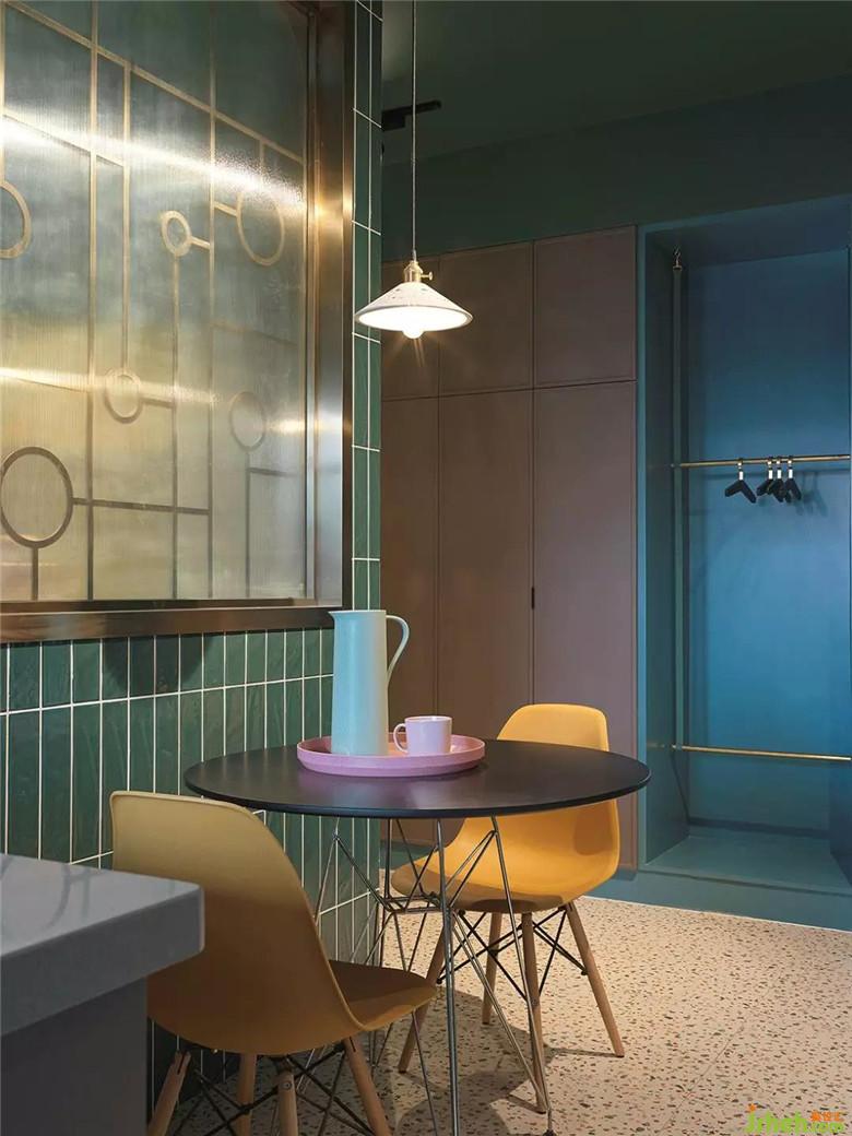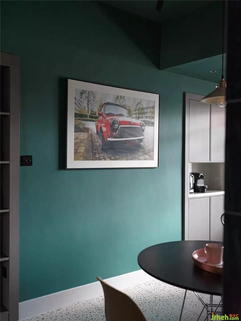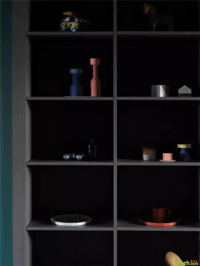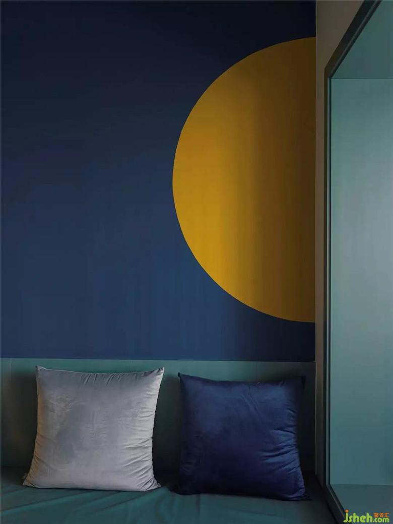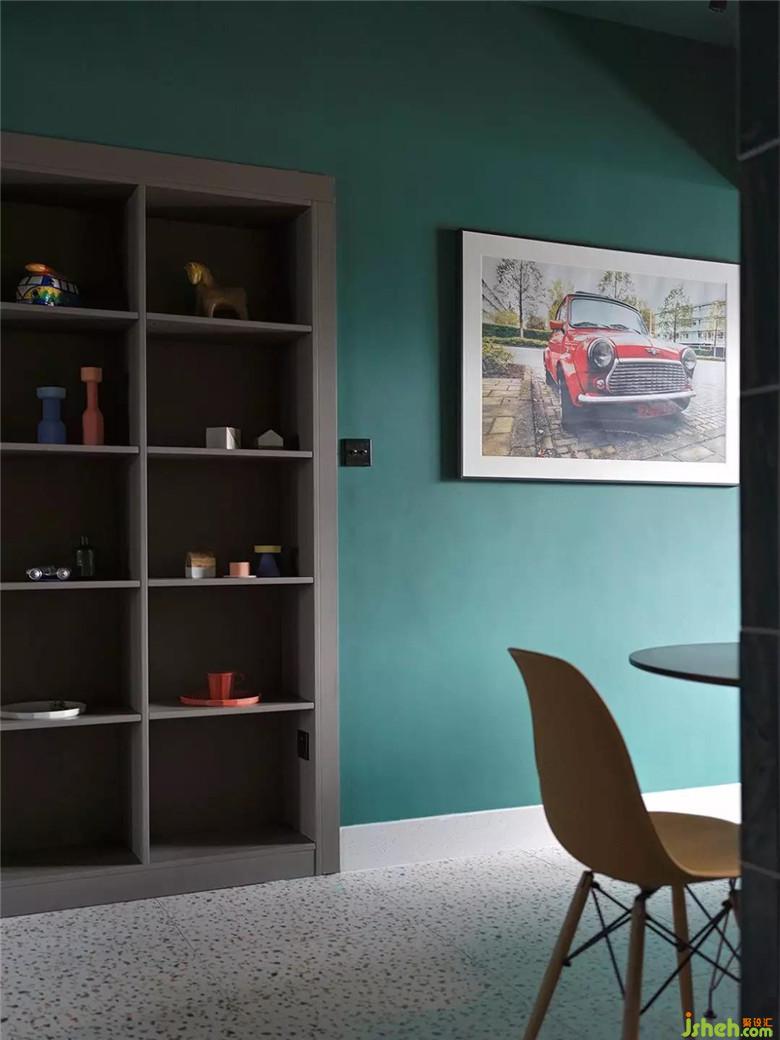 规划好整个空间结构以后,我们对墙面进行了美化:在新建墙体时,尽量预留窗洞,然后用玻璃和几何图案组合为隔断;用灰彩色乳胶漆分色出几何图案丰富视觉;在颜色的分配上,我们采取了局部重色局部留白的方式,留白部分的墙面会作为投影仪幕布功能使用。