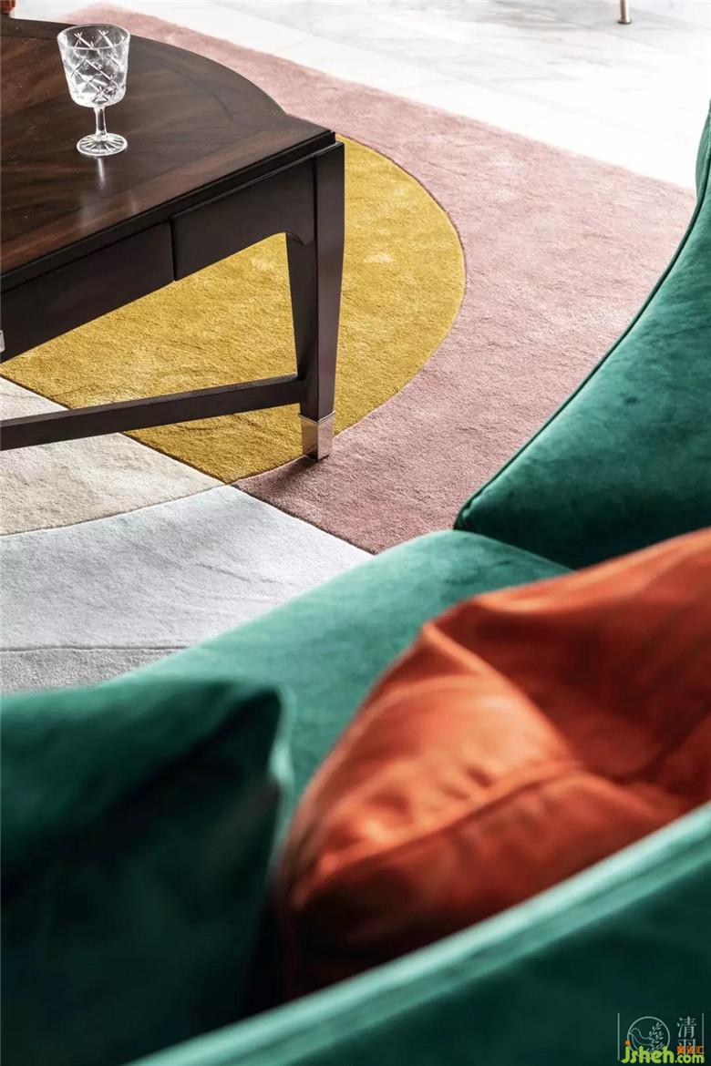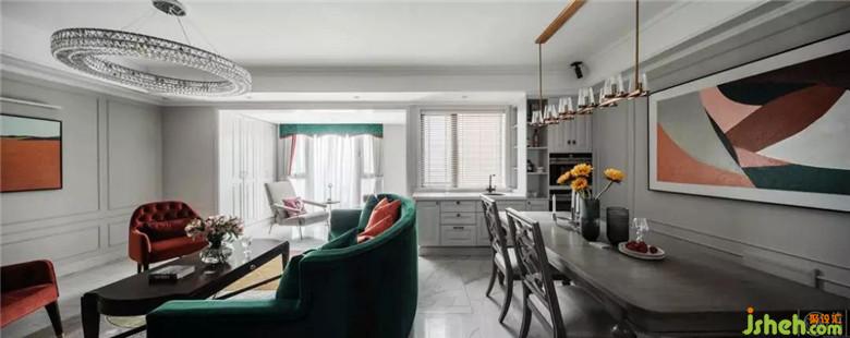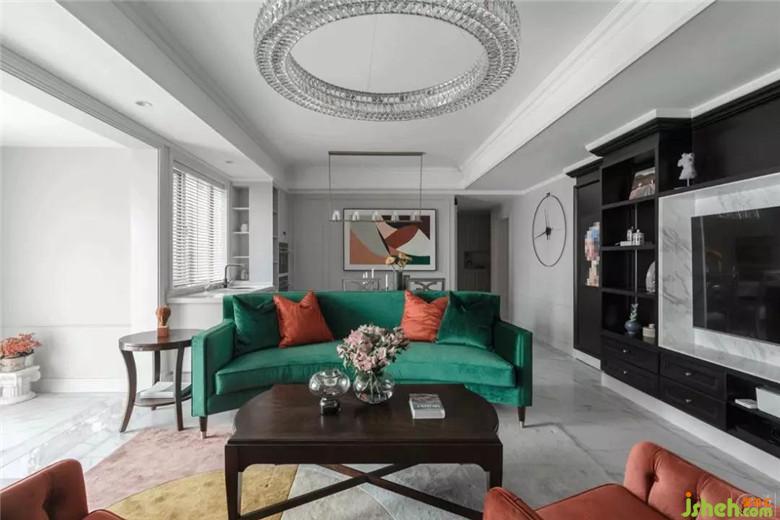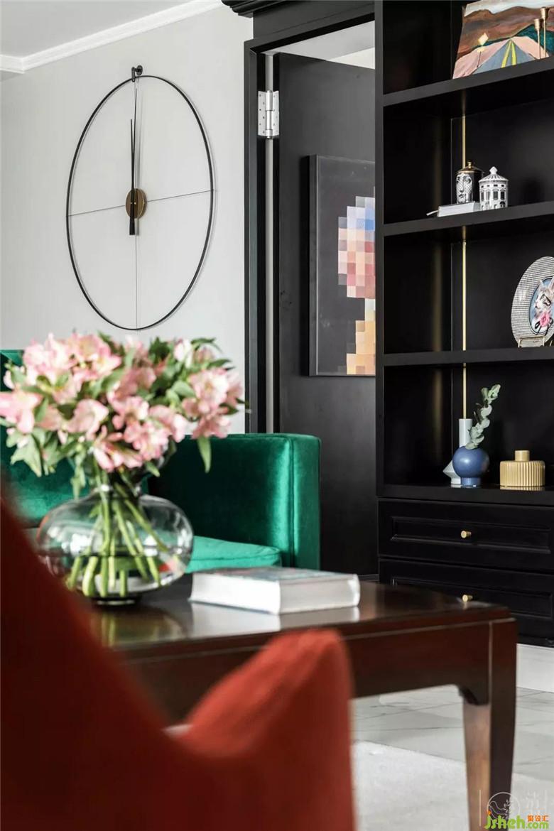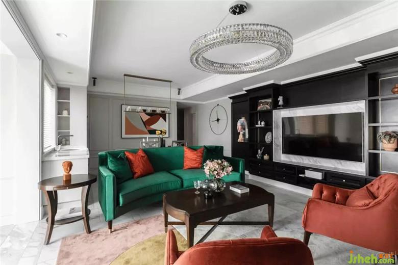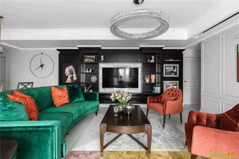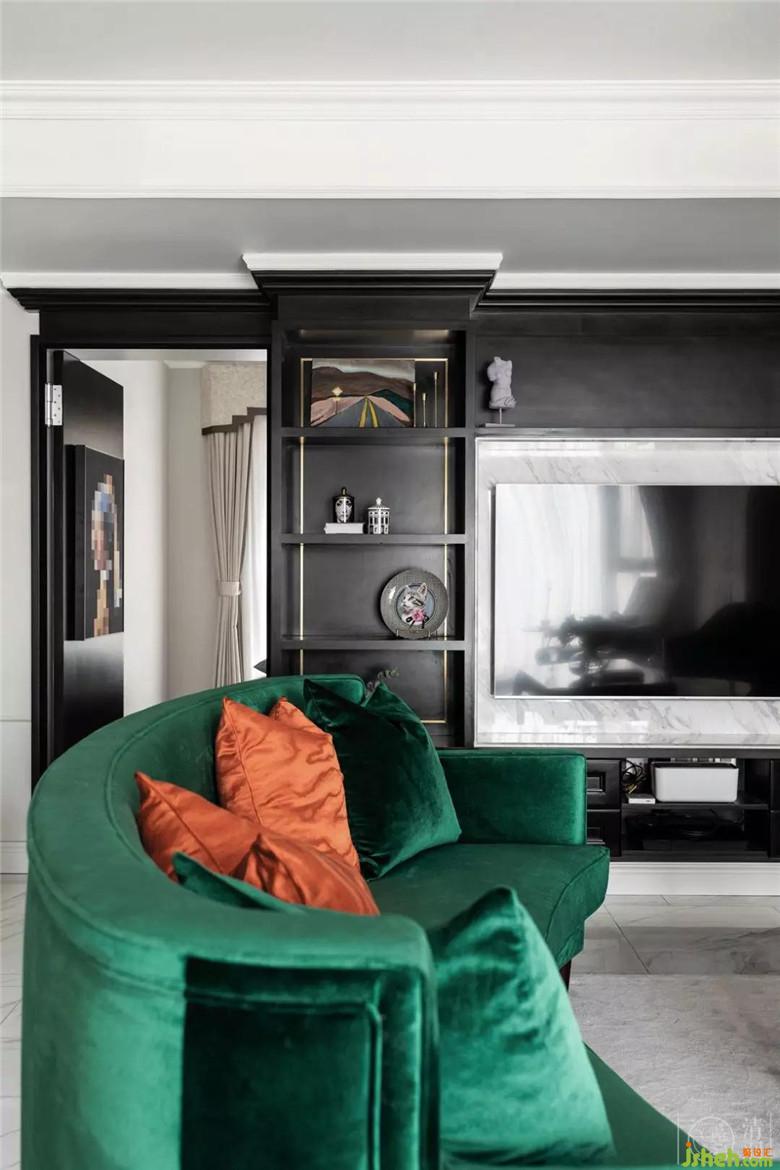 整个空间的配色都是经过了精心的搭配:沙发、窗帘、抱枕、定制油画,墨绿色、黑色和橘色贯穿在整个客厅餐厅区域。