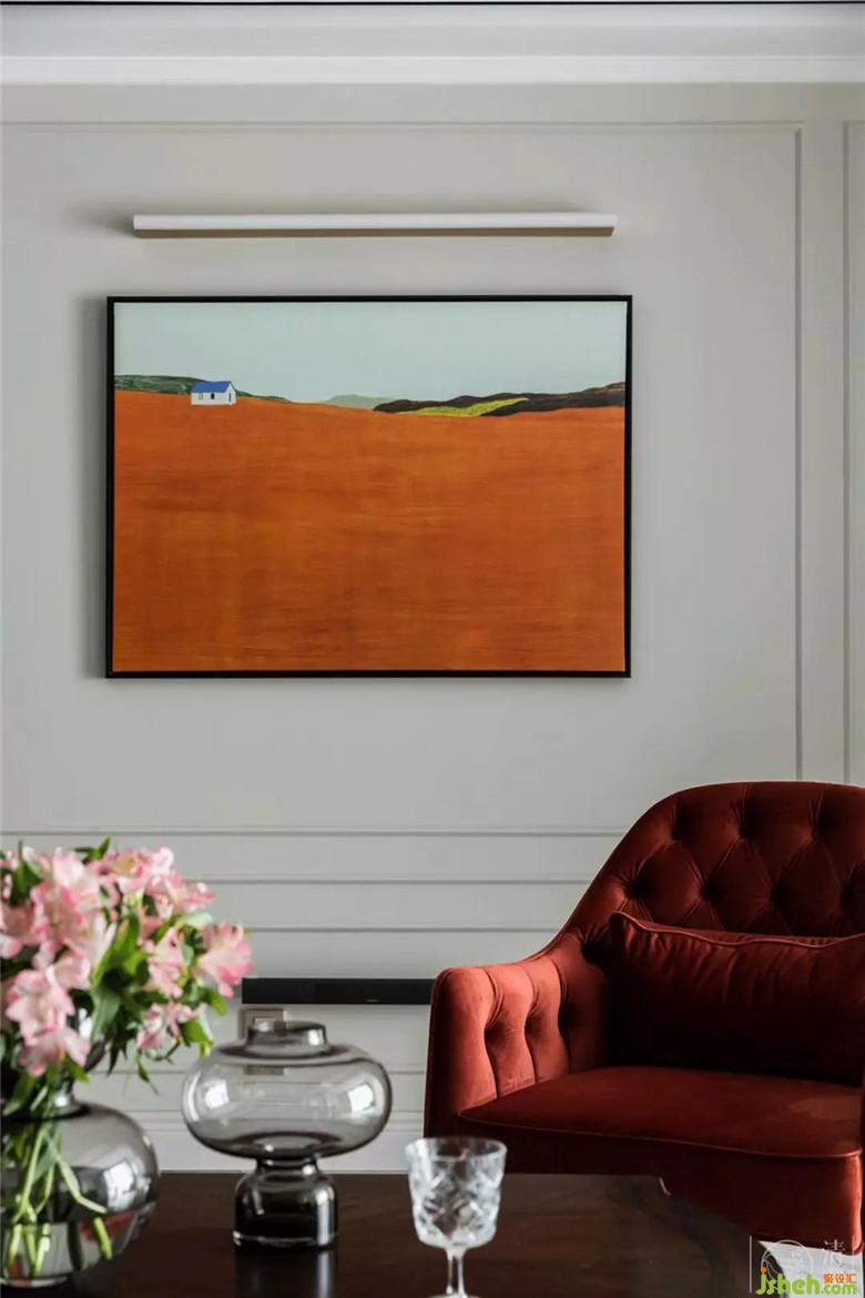 脏脏橘色的单人沙发配合墙面同色系的油画,使得整个空间有了呼应、热情又优雅。